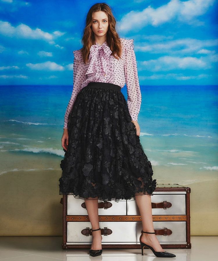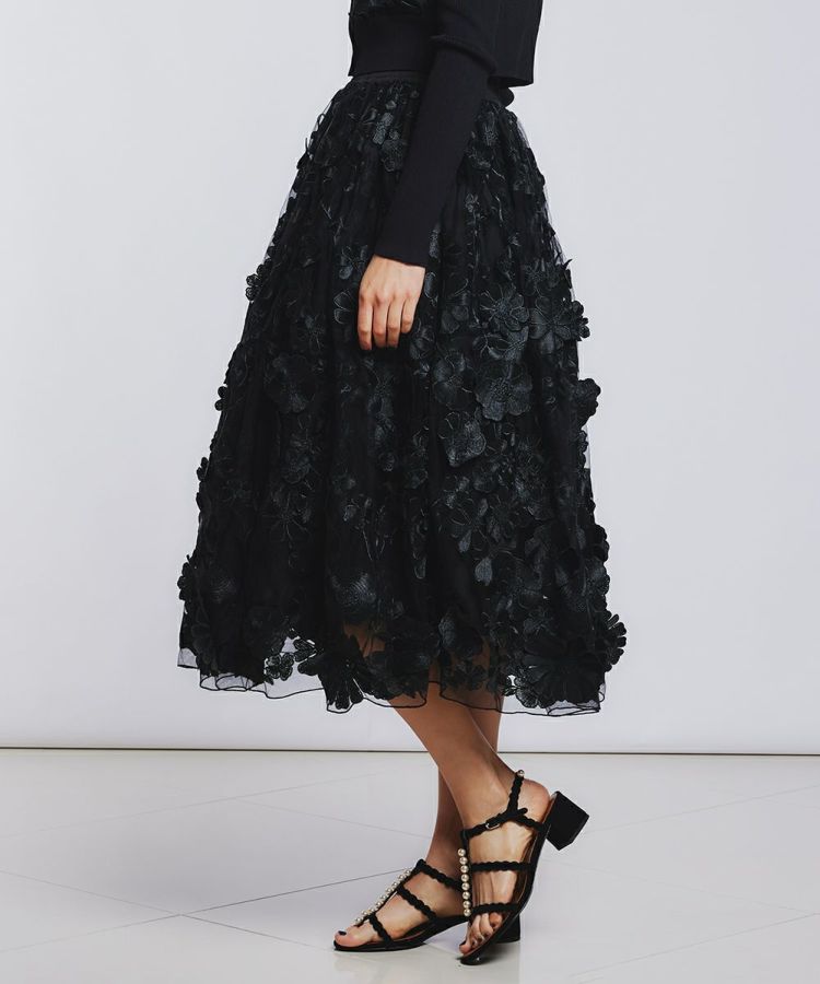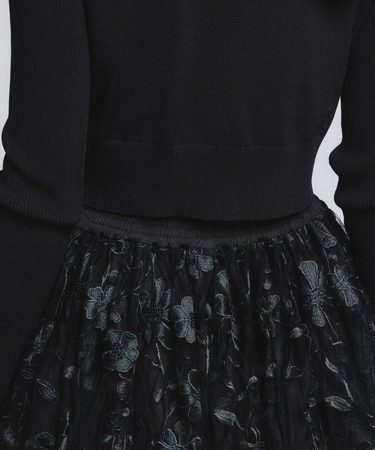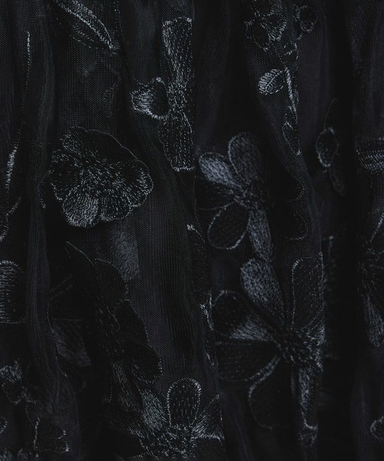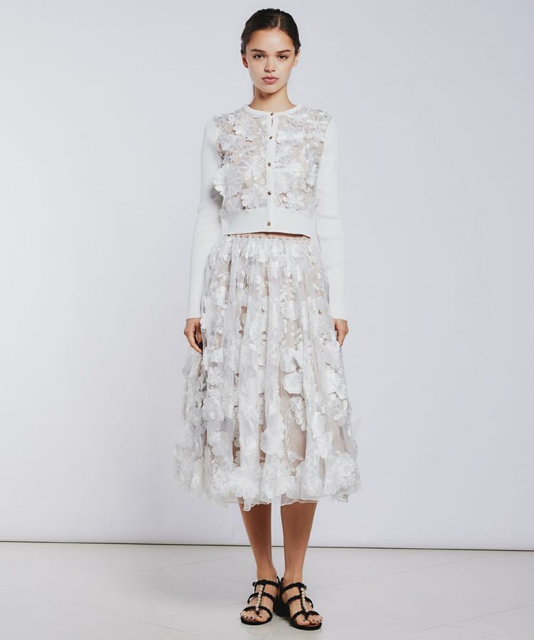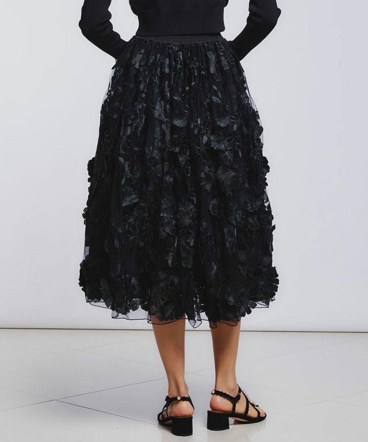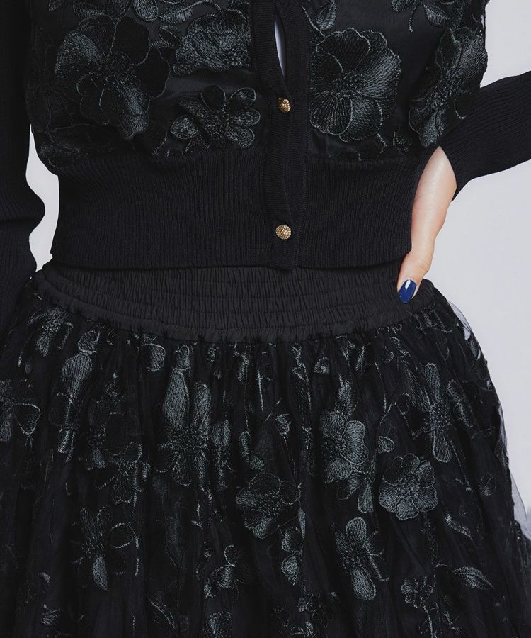 立体的にあしらった、大小のフラワーモチーフレースが目を惹くエレガントなスカート。インナーにパニエが付いているためふんわりとしたボリューム感があり、美しいシルエットを演出します。歩くたびにフラワーモチーフが動き、ドラマチックな存在感がある大人かわいいアイテム。同素材のカーディガン(型番0309230241)とセットで楽しむのはもちろん、お手持ちのブラウスや、夏はキャミソールなどと合わせるのもおすすめです。