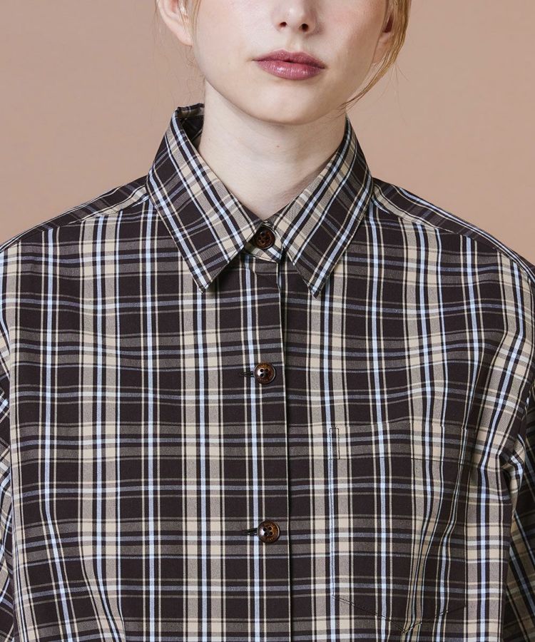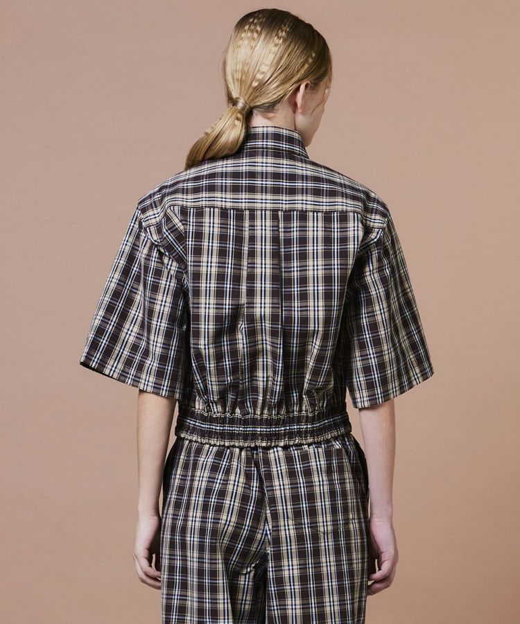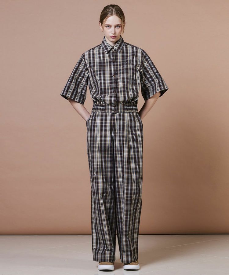 クラシカルなムード漂う半袖チェックシャツ。テキスタイルの名産地・尾州で織り上げたオリジナルチェック素材を使用し、適度なハリ感とさらりとした肌ざわりが魅力です。裾にはシャーリングを施し、ウエストまわりをすっきり見せる工夫もポイント。同素材のパンツ(型番:0206301253)と合わせれば、つなぎ風のセットアップスタイルも楽しめます。