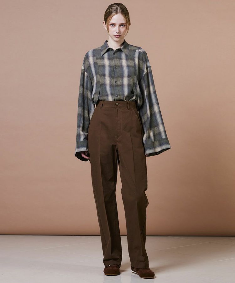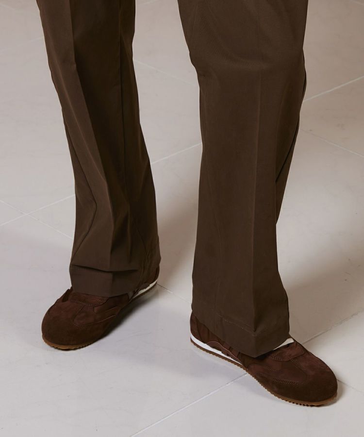 シンプルなデザインで、着回し力抜群のパンツ。ストレッチ性に優れたコットンストレッチピーチ素材を使用し、快適な履き心地を叶えました。美しい落ち感とセンタープレスが縦のラインを強調し、すっきりとしたシルエットを演出。トップスを選ばず合わせやすいため、ワードローブに一枚は持っておきたい万能アイテムです。