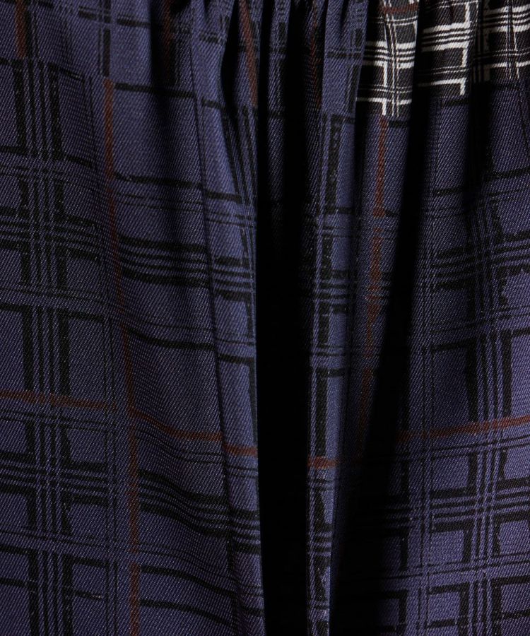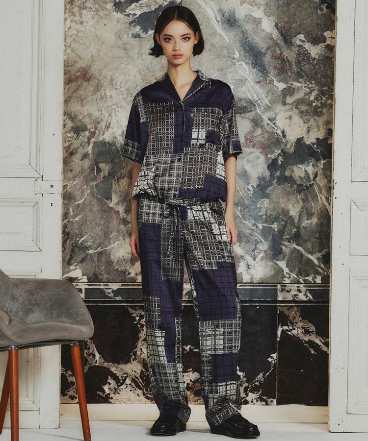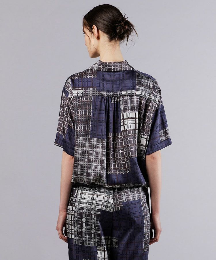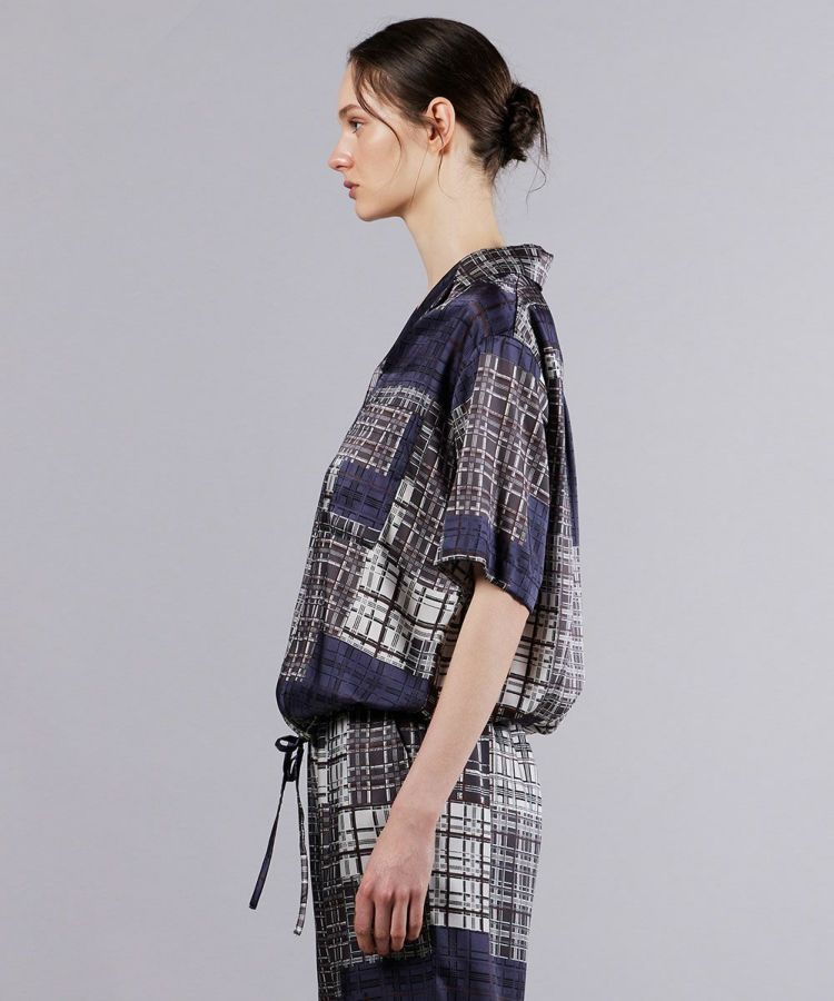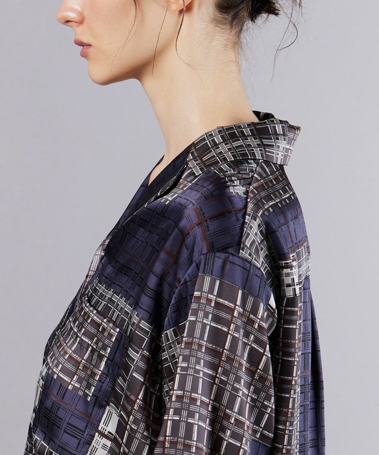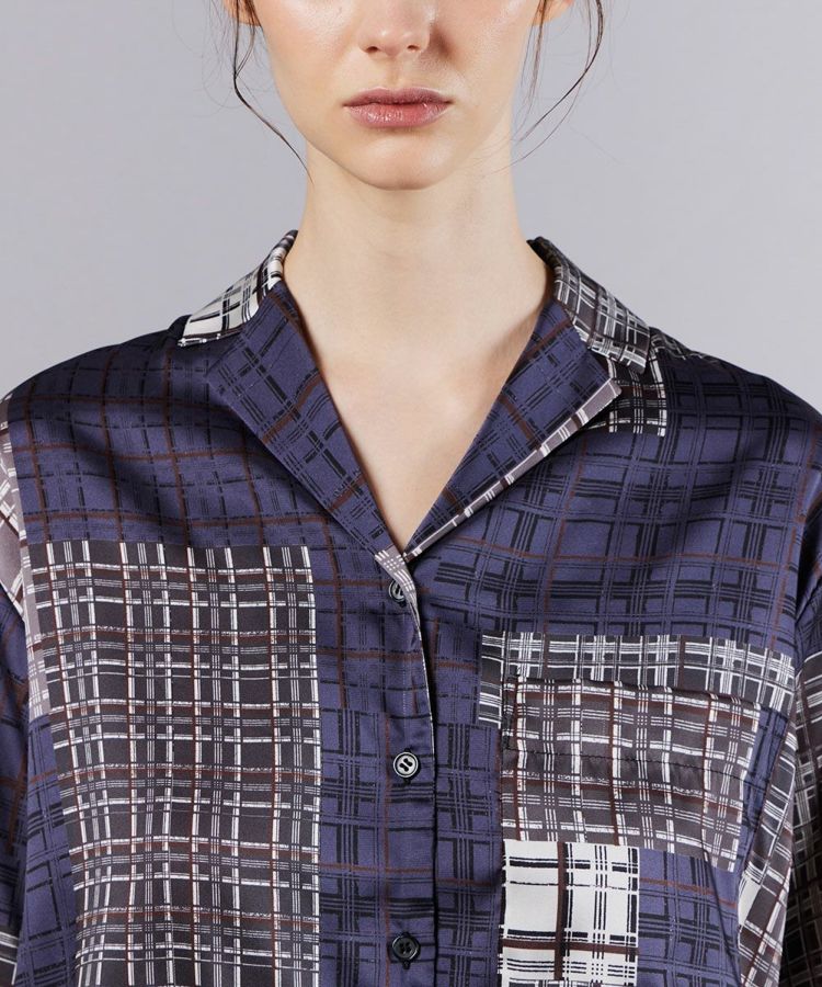 上品な光沢となめらかな手ざわりが魅力のポリエステルサテン素材を使用したシャツ。オリジナルのチェック柄をパッチワーク風に配置し、エッジを効かせた一着に仕上げました。裾はドローストリング仕様でシルエットの調整が可能。同素材のパンツ(型番:0306221253)とコーディネートすれば、一味違う大人のセットアップスタイルを楽しめます。