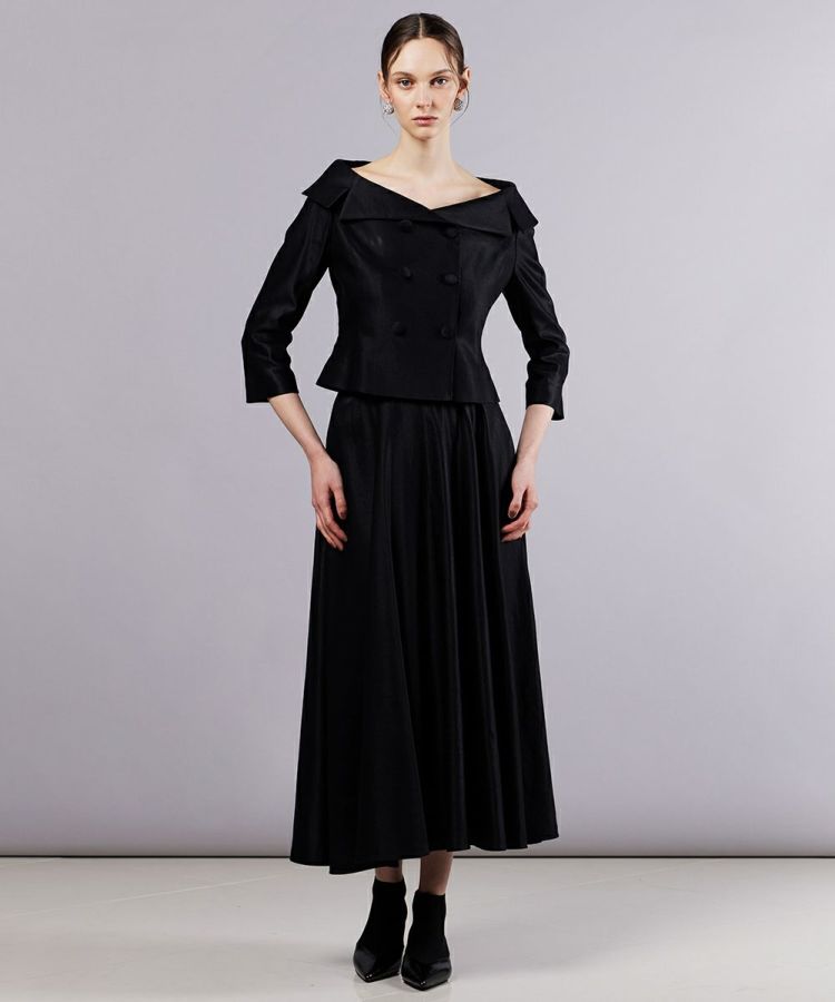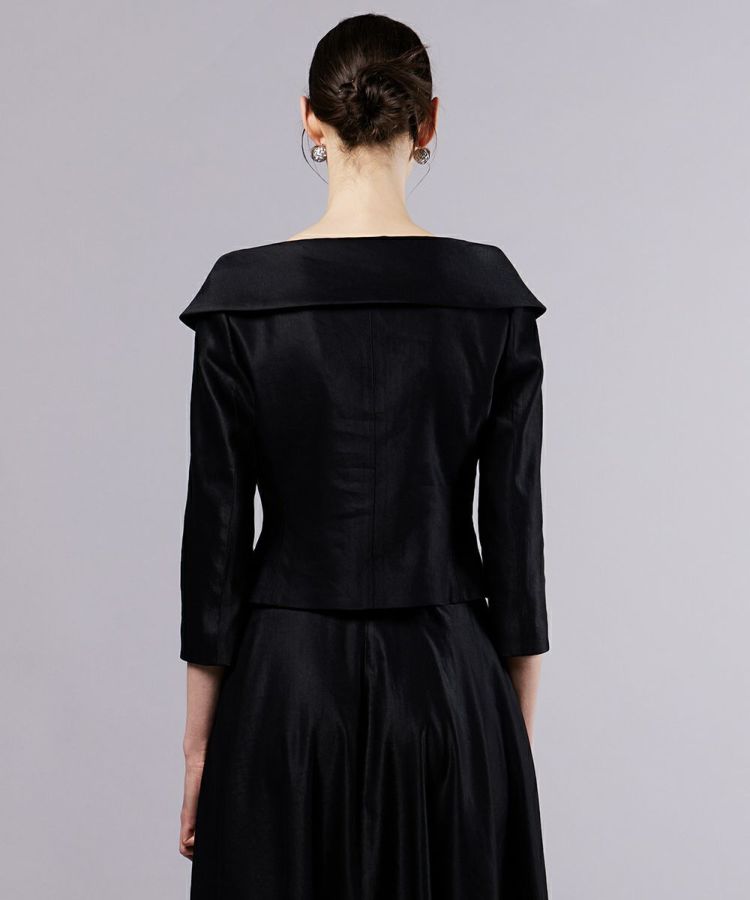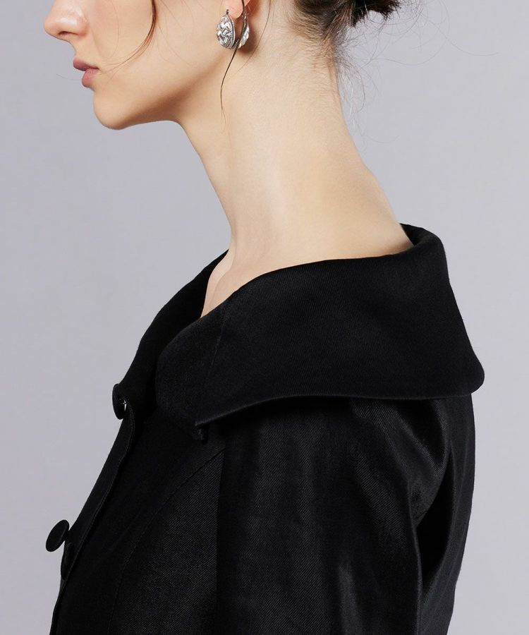 デコルテを美しく引き立てる、オフショルデザインのダブルボタンジャケット。イタリアメーカーと共同開発したオリジナル素材を使用し、麻のナチュラルな表情とレーヨン特有の美しい落ち感が魅力です。タイトなシルエットが女性らしさを引き立て、洗練された印象に。同素材のスカート(型番:0302231253)と合わせれば、ジャケットワンピースのような着こなしも楽しめます。