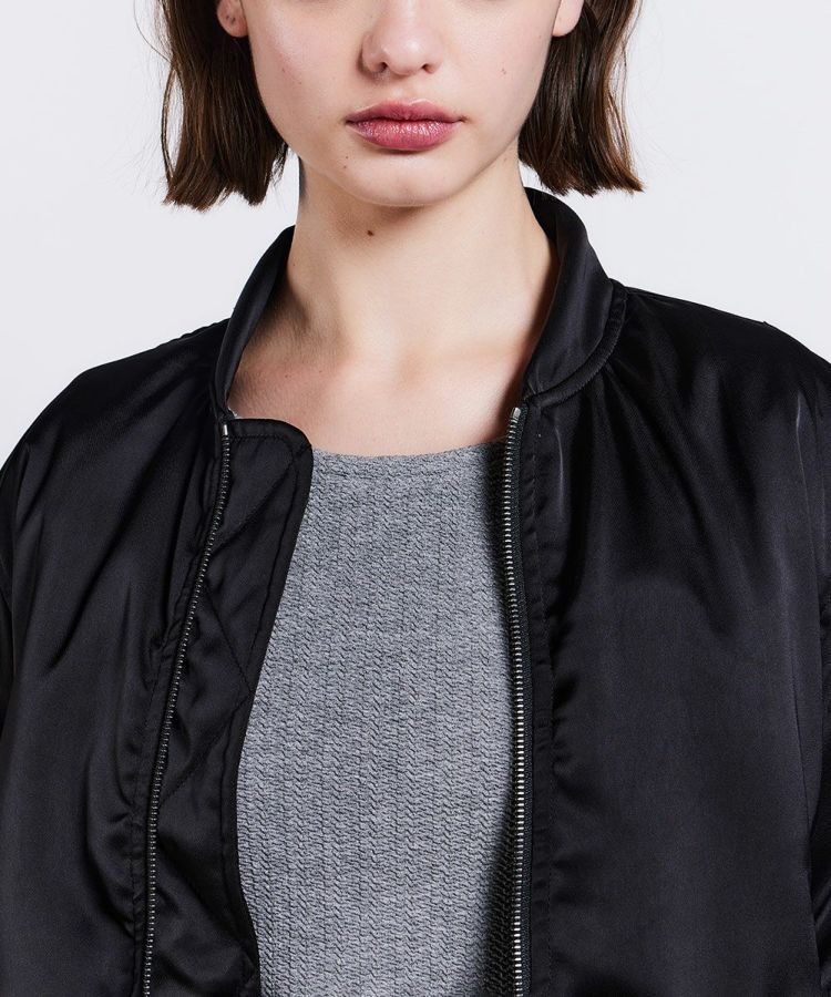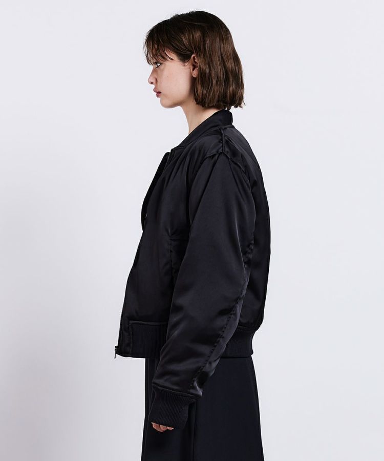 なめらかで美しい表面感が特長になった、MA-1タイプのジャケット。リッチな光沢のあるサテン生地を使用することでカジュアルになりすぎず、エレガントな大人のMA-1に仕上げました。女性らしさを出せるコンパクトなシルエットもポイント。中綿を入れているため、細身でも暖かく着られます。ベーシックなデザインなので着まわし力は抜群。ワンピースなどと組み合わせて甘辛コーデを楽しむのもおすすめです。