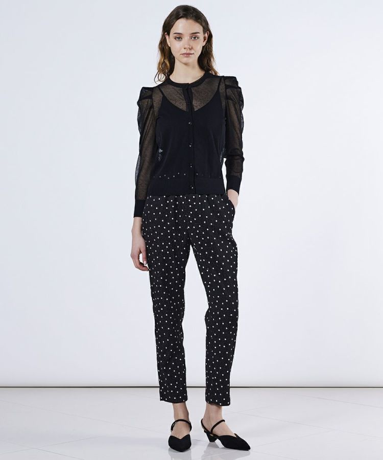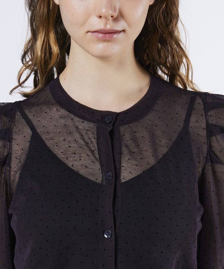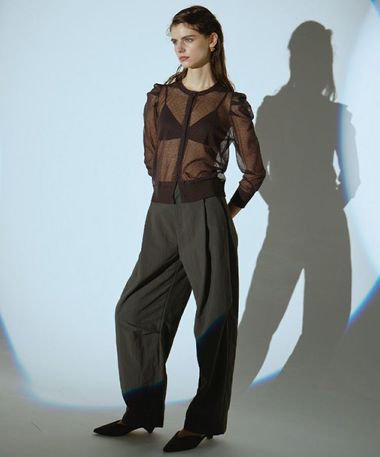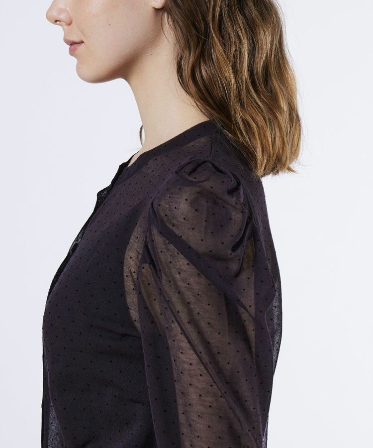 程よく透けるシアーな質感がセンシュアルなムードのカーディガン。シャリっとした清涼感のある風合いで、暑い季節でも快適な着心地を叶えます。さりげなく散りばめたドット柄と、ふんわりとしたパフスリーブが、女性らしさを引き立てるフェミニンなアクセントに。日焼け防止や冷房対策にも活躍する一枚です。
