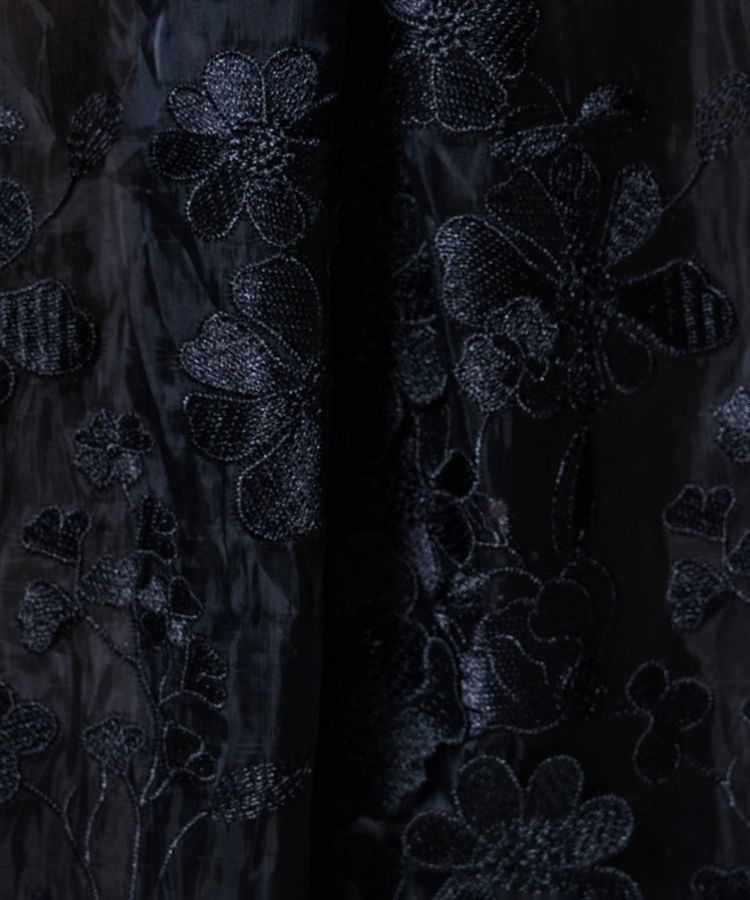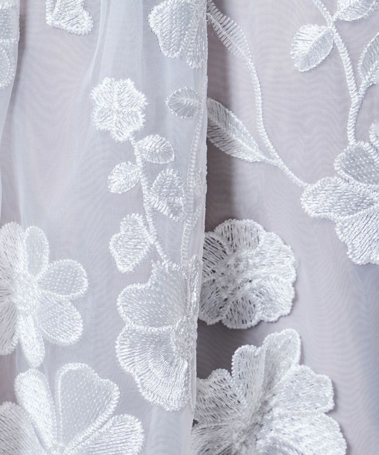 上品な透け感で程よい肌見せが叶うワンピース。立体的な花柄刺繍を全体的に散りばめて、華やかな印象に仕上げました。ウエストのリボンがアクセントになり、メリハリのある女性らしいシルエットを演出。カラーは、使いやすいオフとブラックで展開し、特別な日のお出かけやオケージョンシーンにも映えます。