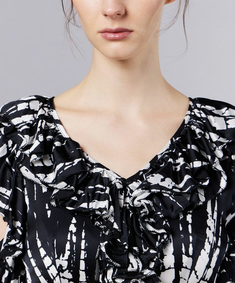 大胆なモノトーンの総柄プリントが目を惹く主役級ブラウス。デコルテを美しく見せるざっくりと開いたVネックが、抜け感を演出します。袖と胸元にはボリュームのあるフリルをあしらい、フェミニンな印象もプラス。甘さとエッジのバランスが絶妙に効いた、大人のブラウスに仕上げました。エスニックな雰囲気漂うデザインは、デニムやシンプルなスカートとの相性が抜群です。
