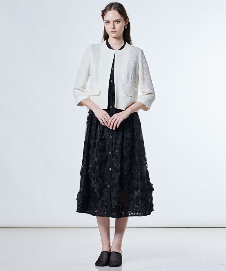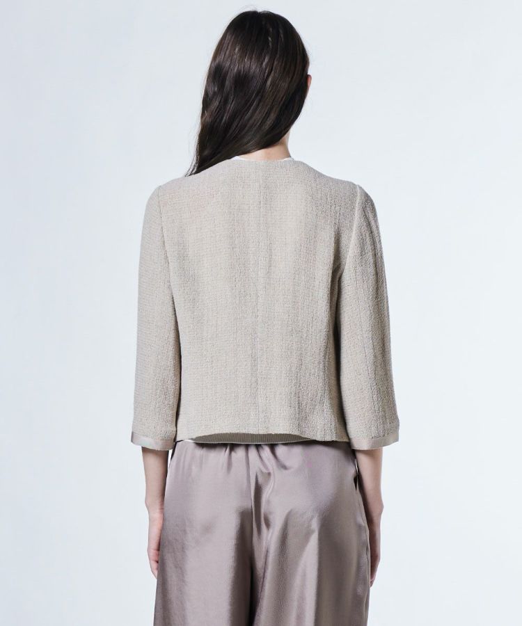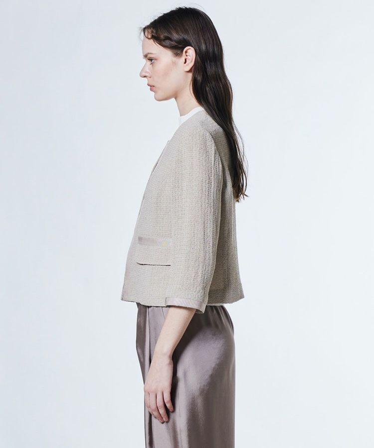 太番手の麻ラミーを使用し、軽やかでドライタッチな着心地が魅力のジャケット。通気性がよく、暑い季節でも快適に羽織れる一着です。首元をすっきりと見せるノーカラーデザインで、抜け感のある印象に。シンプルなデザインだからこそ、ワンピースやフレアスカートとの相性も抜群で、オケージョンシーンにもぴったりです。
