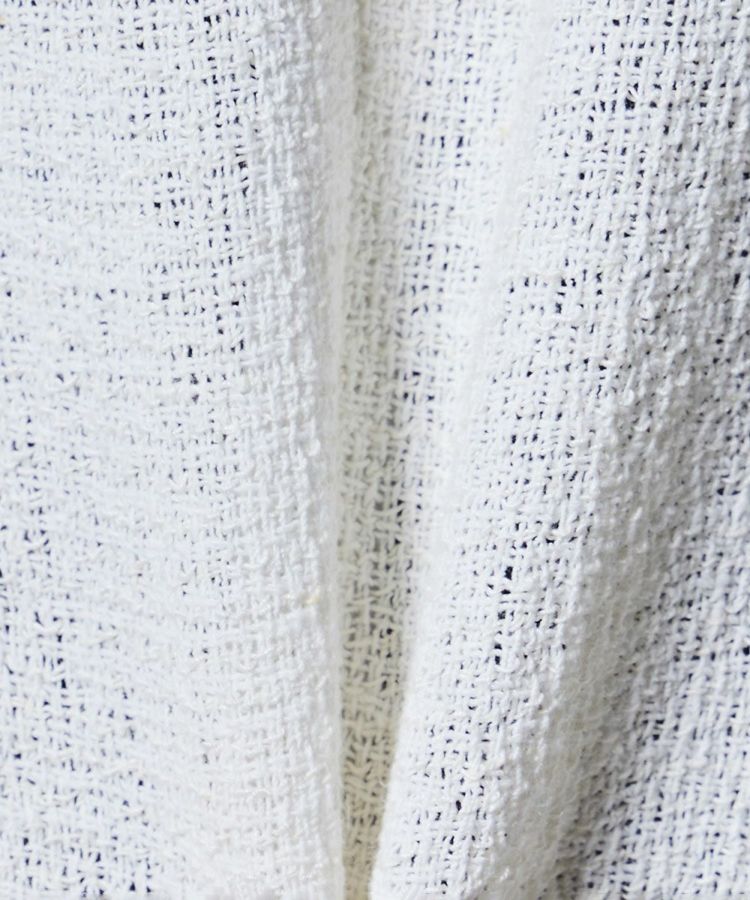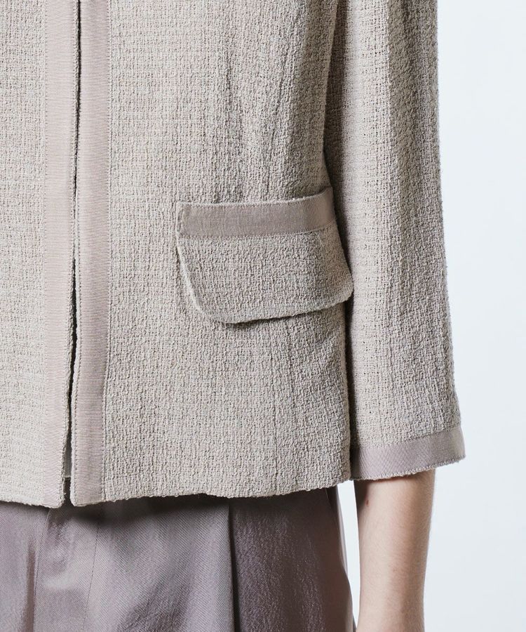 太番手の麻ラミーを使用し、軽やかでドライタッチな着心地が魅力のジャケット。通気性がよく、暑い季節でも快適に羽織れる一着です。首元をすっきりと見せるノーカラーデザインで、抜け感のある印象に。シンプルなデザインだからこそ、ワンピースやフレアスカートとの相性も抜群で、オケージョンシーンにもぴったりです。