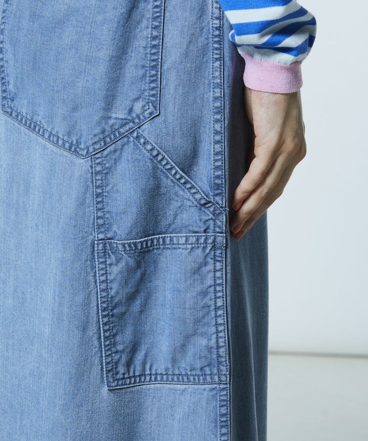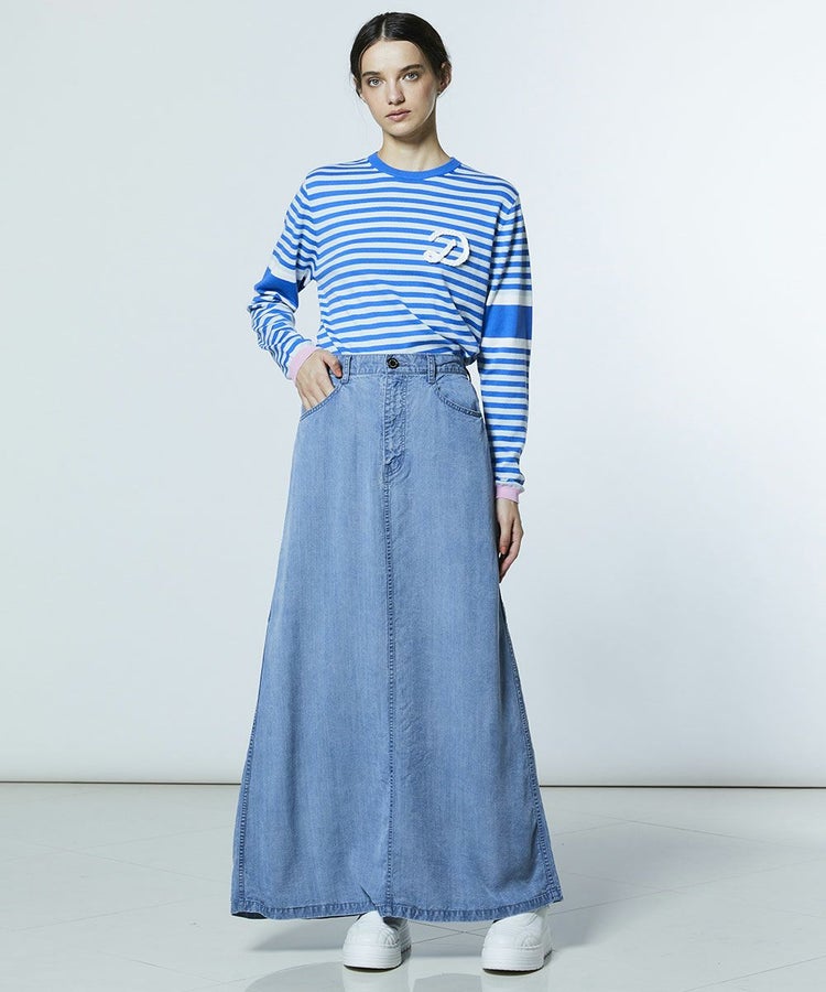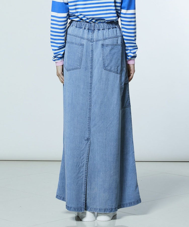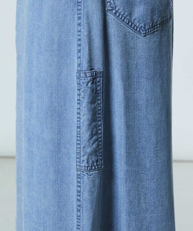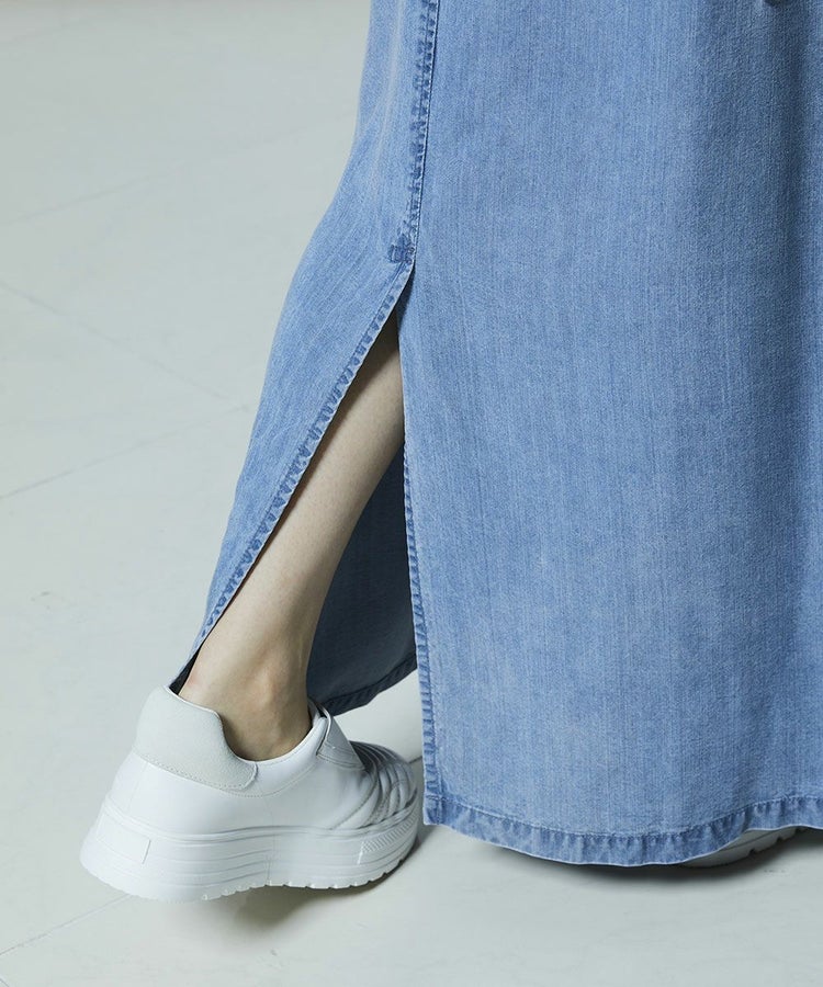 マキシ丈が脚のラインをさりげなくカバーしてくれるロングスカート。なめらかで上品な光沢を持つテンセルデニム素材を使用し、カジュアルすぎず、きれいめな着こなしにもマッチします。後ろに施したスリットが動きやすさを叶えるとともに、程よい肌見せのアクセントに。同素材のシャツ(型番:0204230261)と合わせれば、大人のデニムセットアップコーデが完成します。