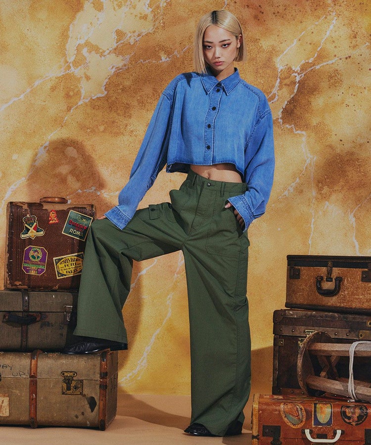 なめらかで上品な光沢を持つテンセルデニム素材を使用したシャツ。カジュアルながらも、きれいめな着こなしを叶える一枚です。クロップド丈のシルエットは、さりげない肌見せを演出しつつ、インナー次第でさまざまなスタイリングが楽しめるのもポイント。同素材のロングスカート(型番:0204230261)と合わせると、ワンピース風にも着こなせます。