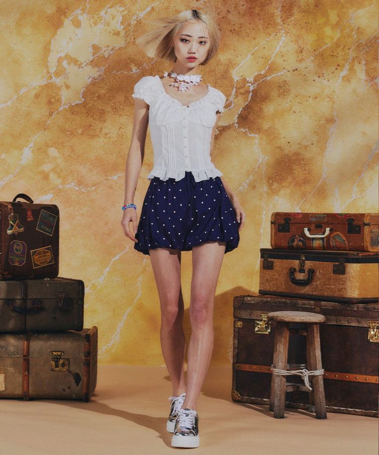 全面にあしらったドット柄が、レトロなムードを演出するショートパンツ。ふんわりと広がるバルーンシルエットが、大人の可愛らしさを引き立ててくれます。カラーはベージュとネイビーの2色展開。同素材のカーディガン(型番:0209190261)とのセットアップスタイルもおすすめです。