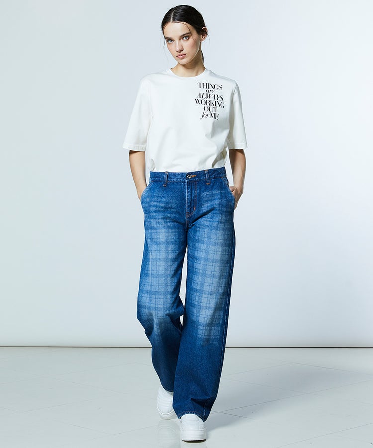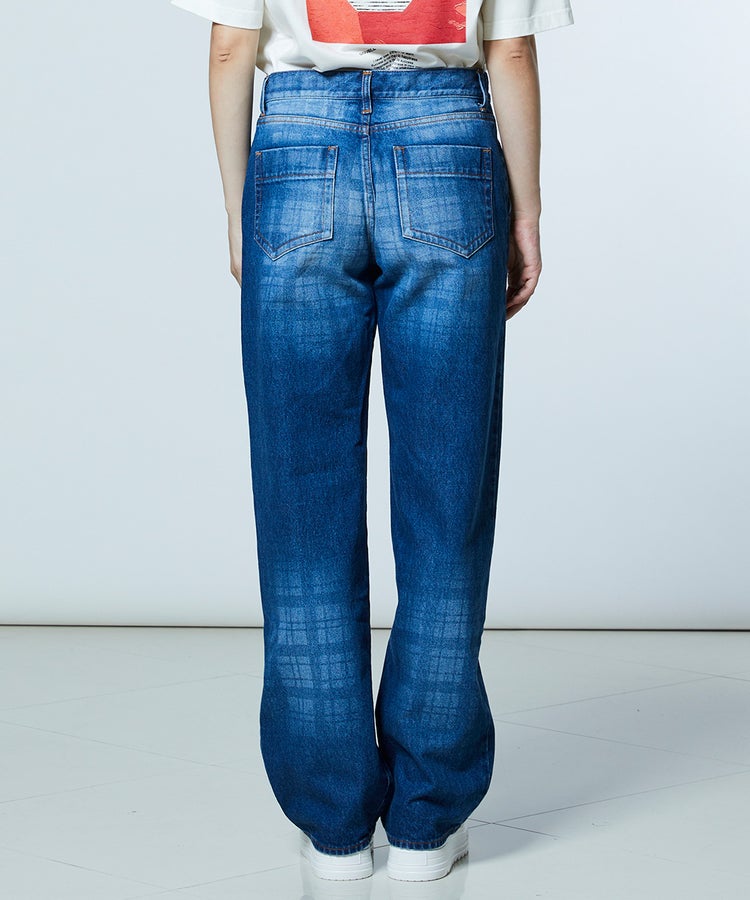 弱テンションで織り上げた生地が、ヴィンテージライクな表情を引き立てるデニムパンツ。独特なムラ感にさりげないチェック柄を重ね、個性の光るデザインアクセントをプラスしました。縦のラインをきれいに見せるストレートシルエットで、すっきりとした印象に。ひと味違うデニムは、同素材のジャケット(型番:0205350261)と合わせることで、存在感のあるセットアップスタイルが完成します。