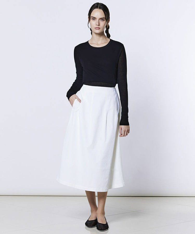 吸汗速乾性と通気性、肌離れの良さに優れたリランチェス素材を使用したスカート。程よく広がるフレアシルエットが、エレガントで軽やかな印象を演出します。カラーは爽やかなオフホワイトと、スタイリングに自然と馴染むカーキの2色展開。オフィスカジュアルにはもちろん、オケージョンシーンでも活躍する1枚です。