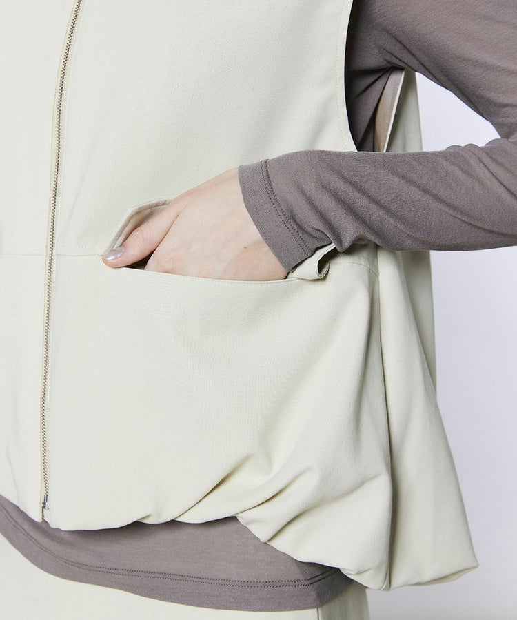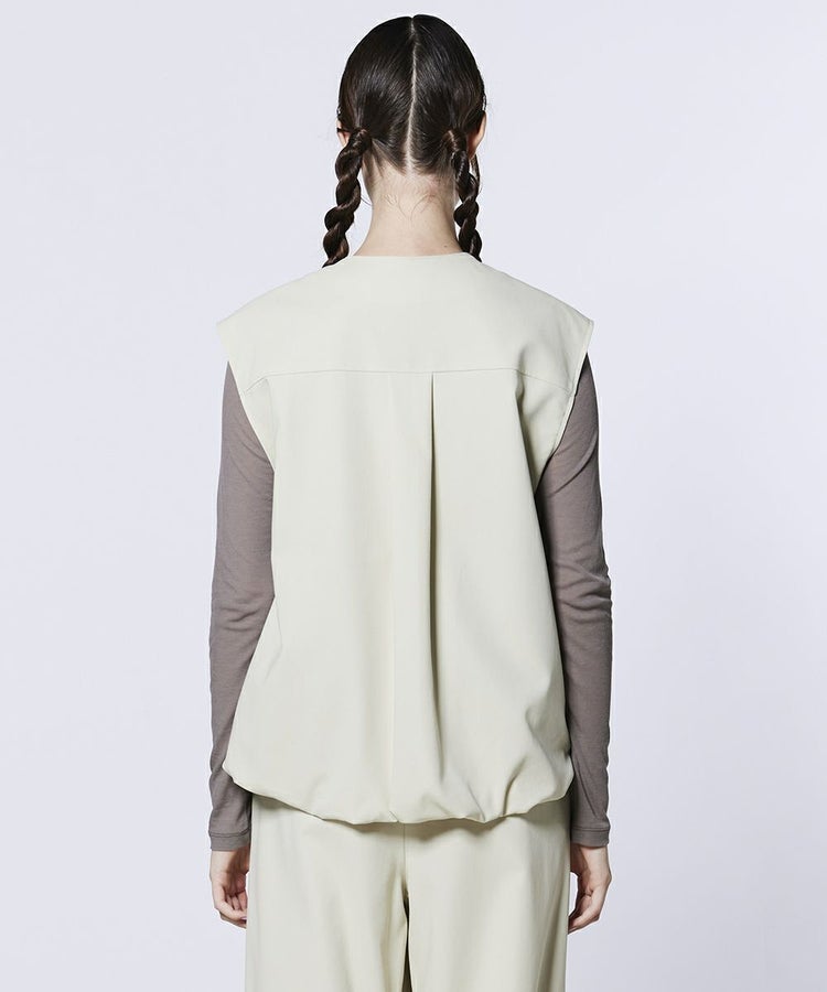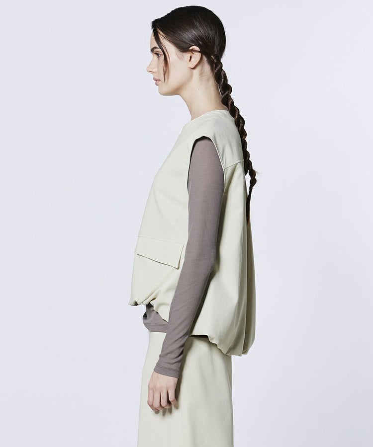 美しいドレープ感と立体的なシルエットを生み出すダブルクロス生地を使用したベスト。ふんわりとしたボリュームのあるデザインが、さりげなく可愛らしさを添えてくれます。カラーはコーデに取り入れやすいベージュとキャメルの2色展開。同素材のパンツ(型番:0306221261)と合わせれば、モード感漂う洗練されたセットアップスタイルが完成します。
