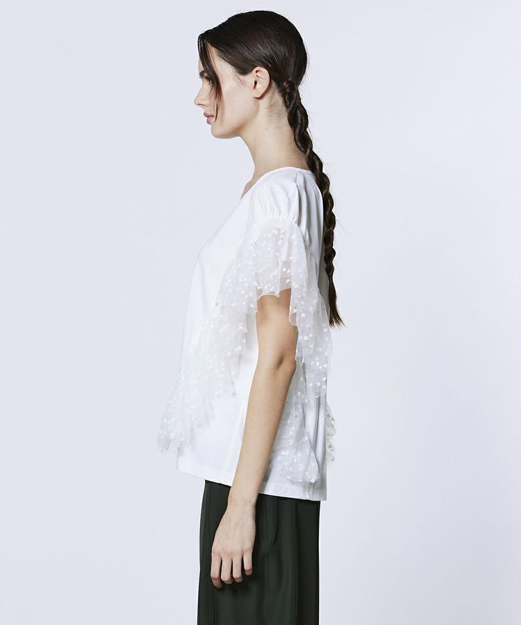 袖から裾にかけて大胆にあしらったチュールが、華やかな存在感を放つカットソー。チュール部分にはさりげなくハート柄を施し、キュートなアクセントを添えました。Vネックデザインが首元をすっきりと見せ、スタイルアップ効果も抜群。シンプルながらガーリーなエッセンスを効かせた一枚で、ベーシックなボトムスと合わせるだけで大人かわいいスタイリングが完成します。