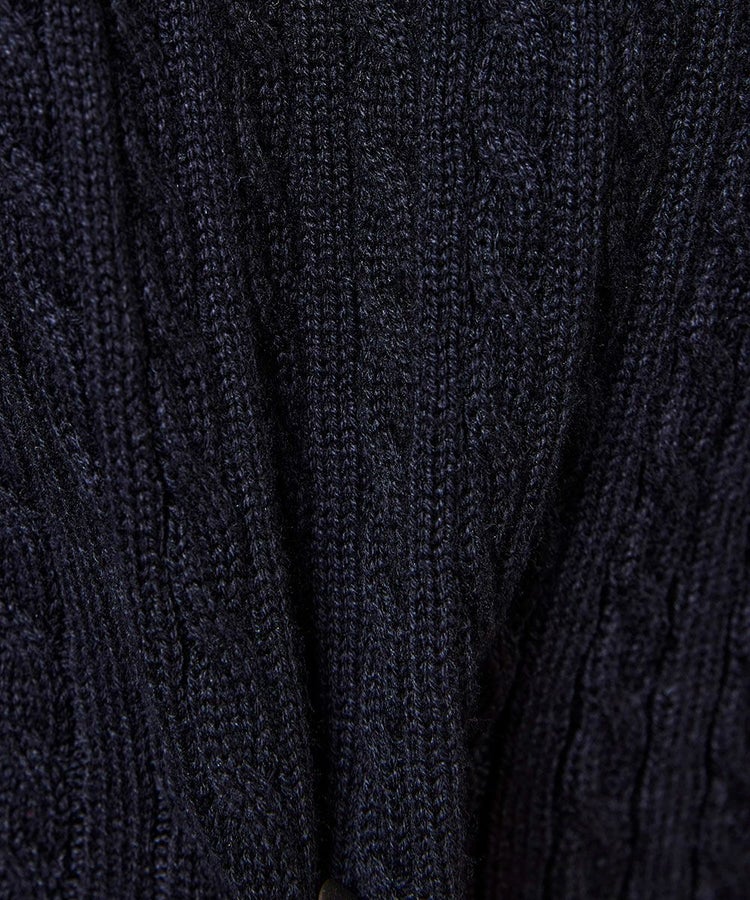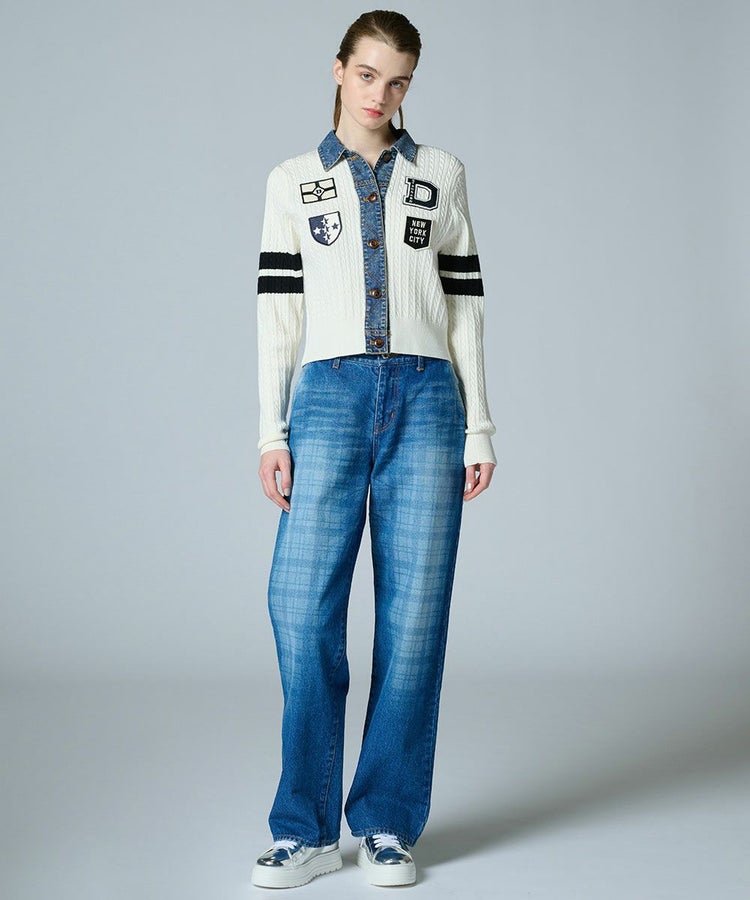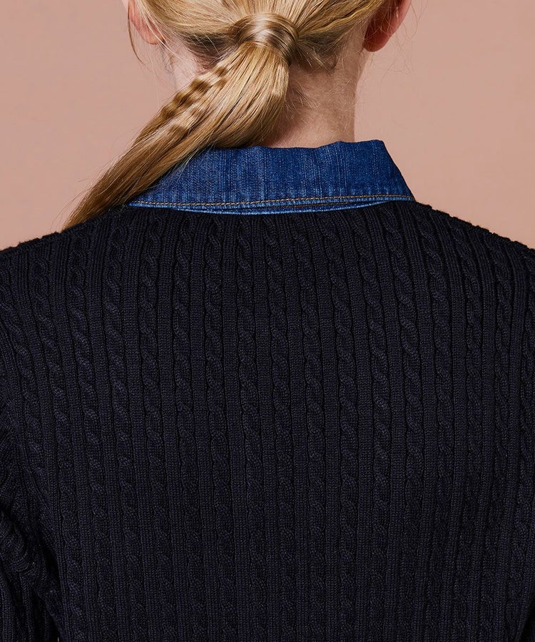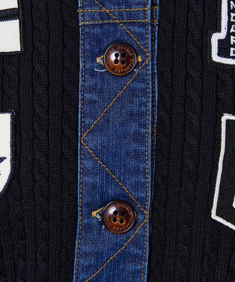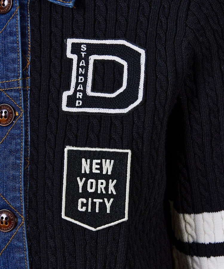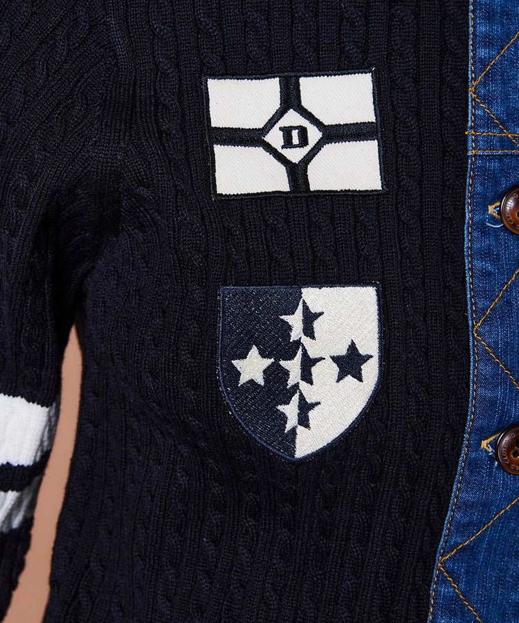 オリジナルワッペンが、アメリカンヴィンテージのムードを添えるニット。アイビースタイルを思わせるスクールライクなデザインで、クラシカルな印象に仕上げました。ケーブル編みのニットにデニム素材を組み合わせた異素材MIXが、デザインのポイントに。デニムとリンクさせた着こなしはもちろん、シンプルなボトムスと合わせてもバランスよく映える一枚です。