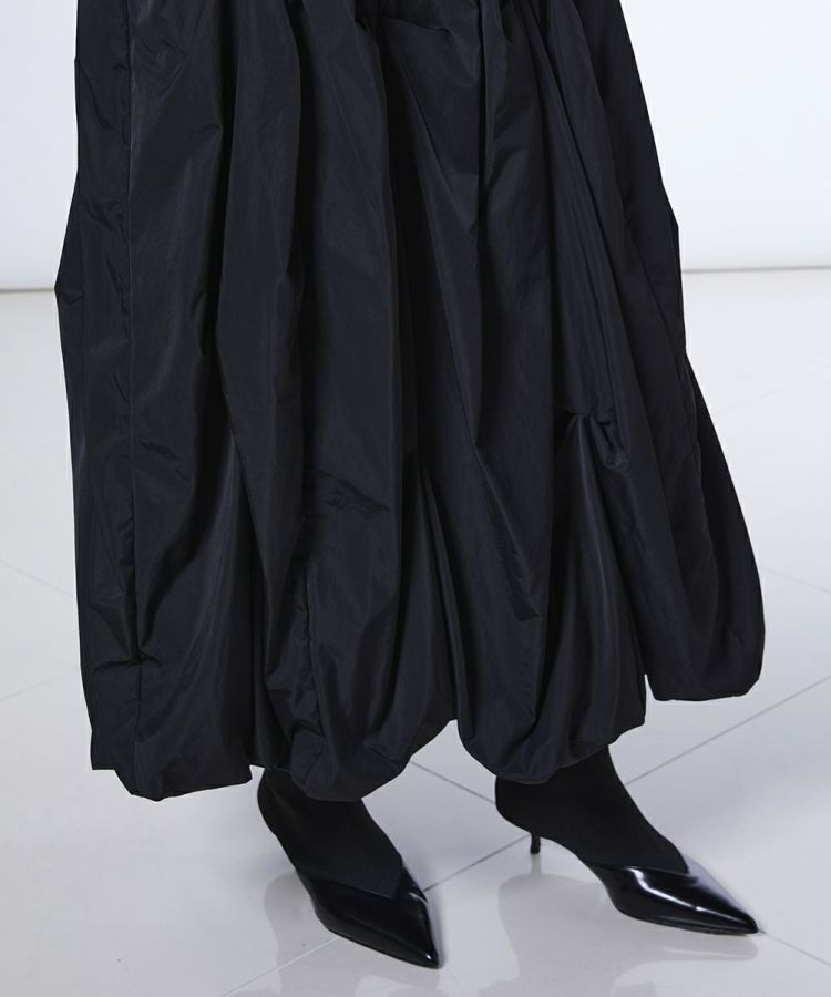 ボリューム感のあるバルーンシルエットが印象的なロングスカート。ランダムに施したタックが華やかさを添え、動きのある表情を演出します。存在感のあるデザインには、Tシャツやコンパクトなトップスが相性抜群。トップスを変えるだけでカジュアルにもモードにも着こなせる一枚です。