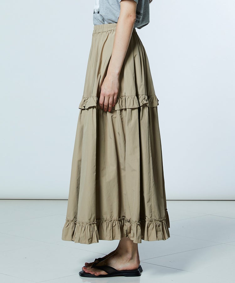 サラっとした肌触りに程よい光沢と通気性を兼ね備えたサマーブロード素材を使用したスカート。ティアード調のデザインが、シンプルながらも女性らしい柔らかな印象を演出します。カラーはコーディネートに馴染みやすいベージュとカーキの2色展開。軽やかな素材感で着心地も良く、着回し力の高い一枚です。
