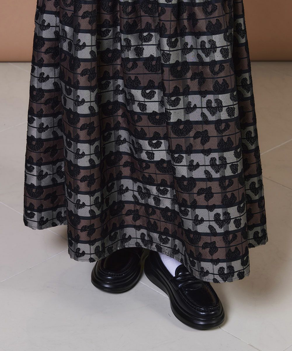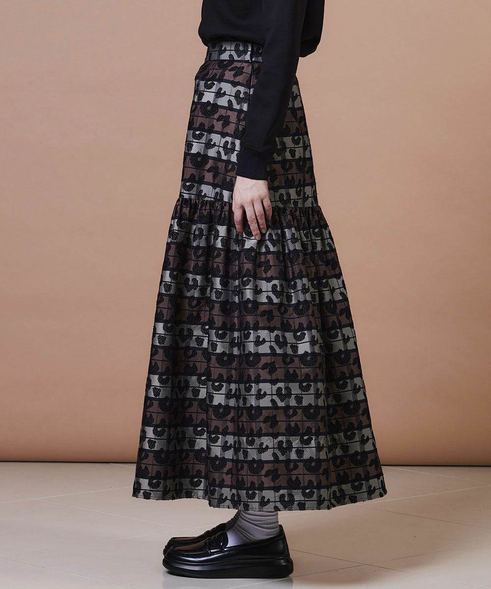 絶妙なハリ感としなやかさを兼ね備えたロングスカート。落ち着いたトーンのヒョウ柄が上品に映え、気軽にアニマル柄を楽しめます。ボリュームのあるシルエットが腰まわりを自然にカバーしてくれるのも高ポイント。足元まで届くスーパーロング丈がエレガントな雰囲気を演出し、シンプルなトップスを合わせるだけでシックなスタイリングが完成します。