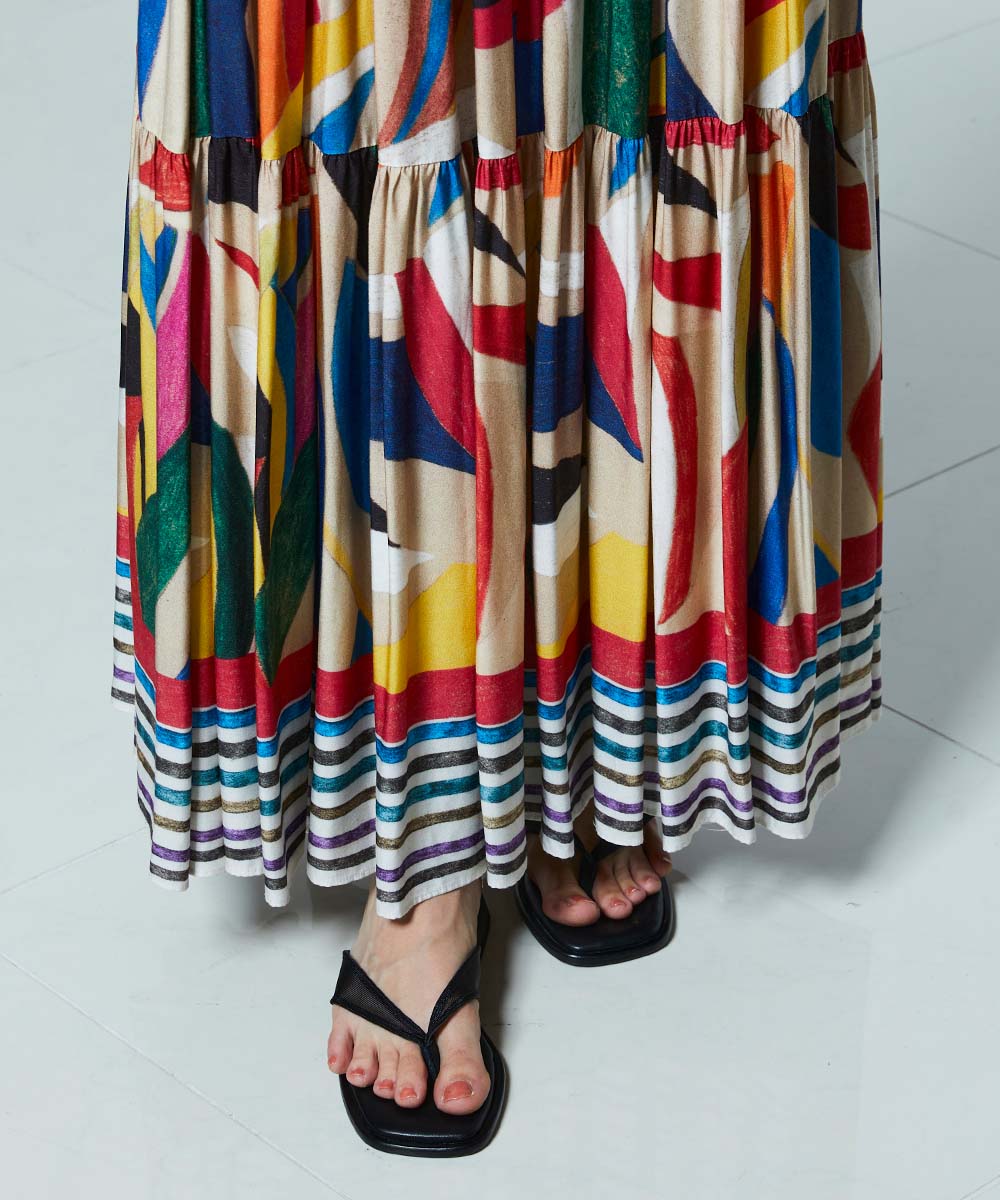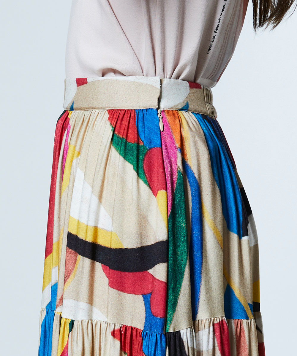 カラフルで存在感抜群のロングスカート。たっぷりと施したギャザーとティアード調のシルエットが動くたびに華やかさを演出します。とろみのある美しい落ち感とドレープ性、しなやかな肌触りに上品な光沢を備えたレーヨン素材を使用し、エレガントな雰囲気をプラス。同素材のシャツ(型番:0204490261)と合わせれば、統一感のある印象的なセットアップスタイルも楽しめます。