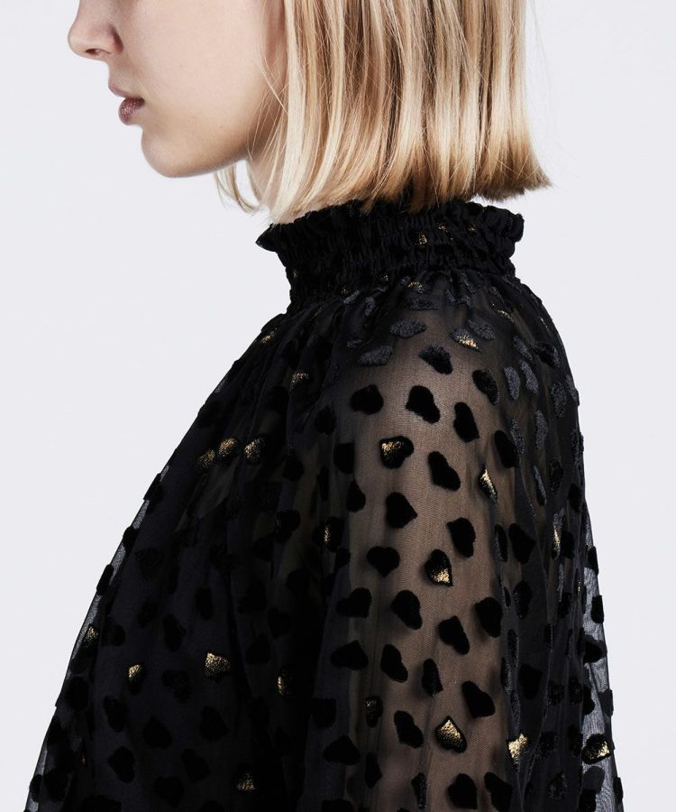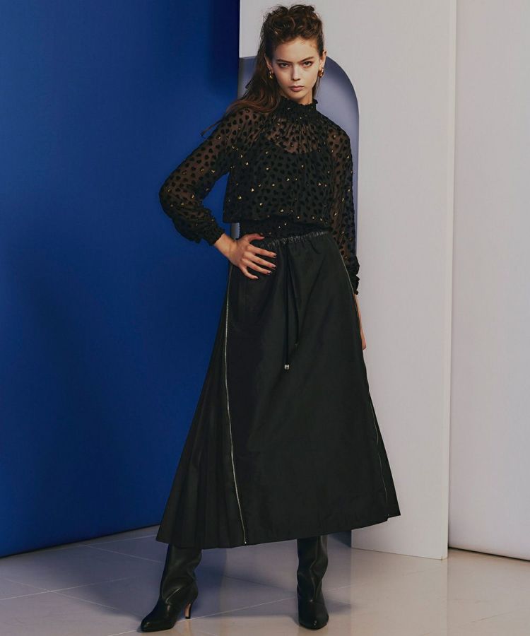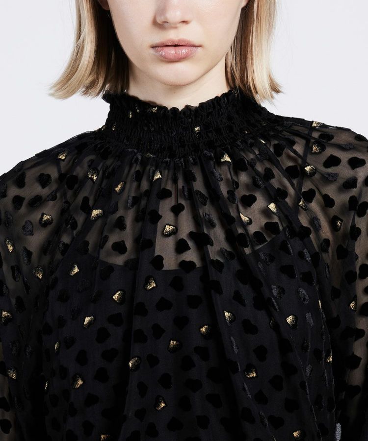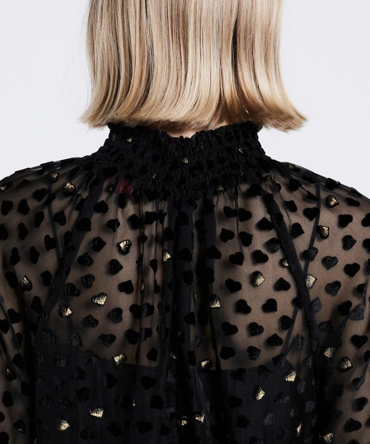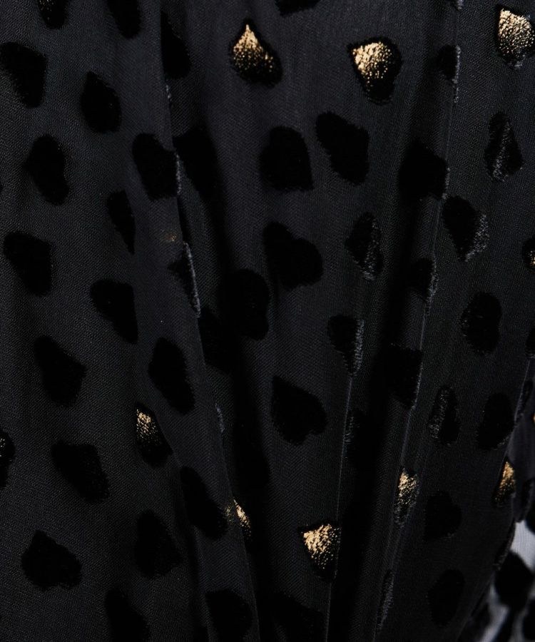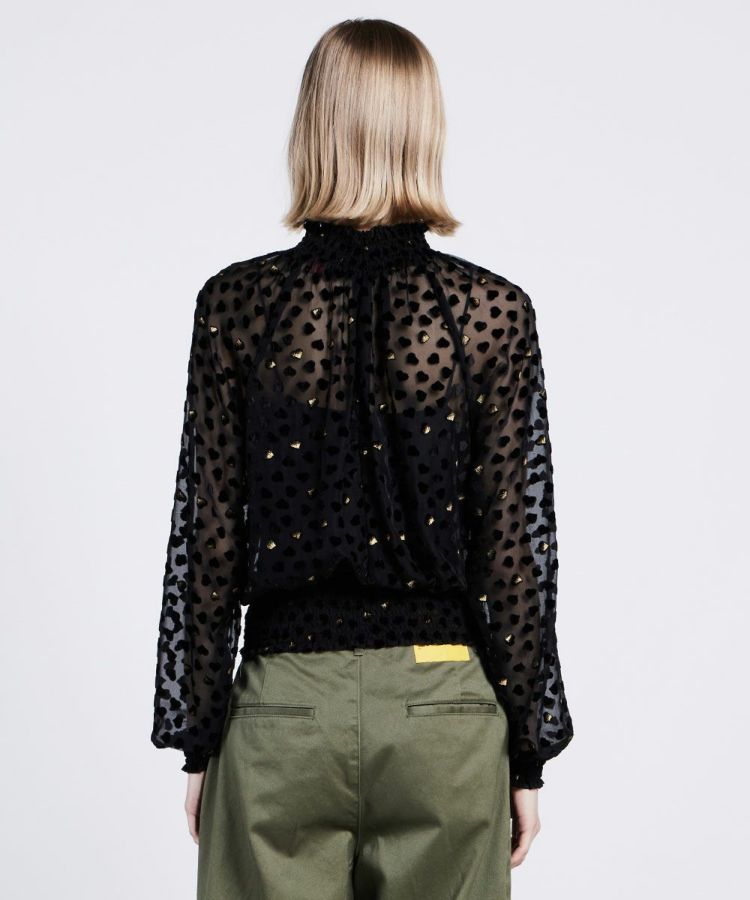 ストレッチ性に優れたトリコット素材を使用した、着心地抜群のブラウス。ハート型のオパール加工を施し透け感を出した上で、さらにランダムにゴールドプリントをON。独特の美しいグラデーションを表現しました。体型を拾わないゆったりとしたシルエットでありながら、女性らしさが漂うアイテム。ウエストゴムなどメリハリをつけているため、コーディネートした時の全身バランスがきれいに決まるのが魅力です。
