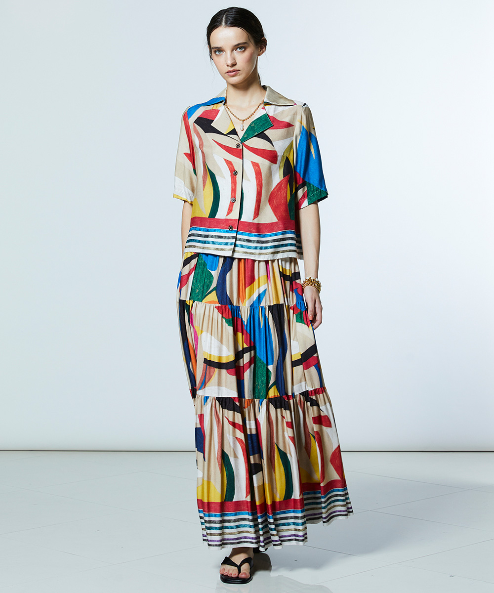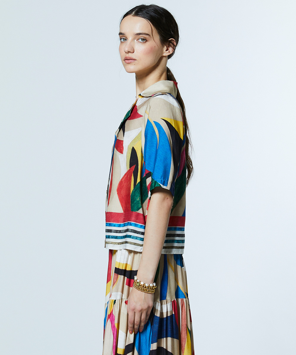 存在感のあるカラフルな柄が目を惹くシャツ。とろみのある美しい落ち感とドレープ性、しなやかな肌触りと上品な光沢を併せ持つレーヨン素材を使用し、エレガントな雰囲気に仕上げました。オープンカラー仕様で自然なこなれ感を演出。同素材のスカート(型番:0202491261)と合わせれば、個性が際立つワンピース風のスタイリングが楽しめます。