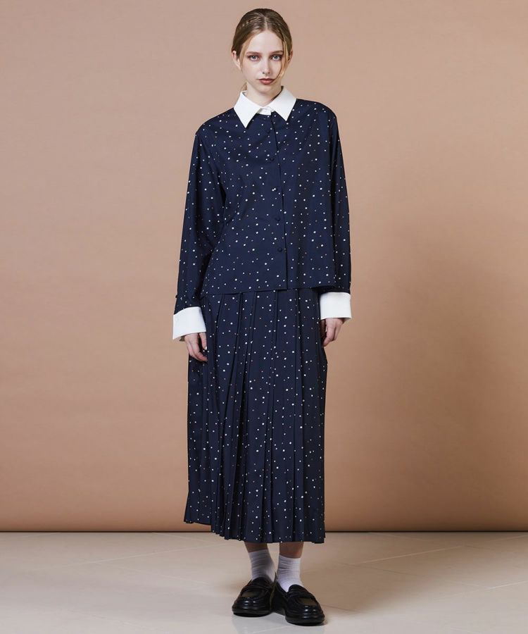 上品な光沢感となめらかな肌ざわりが魅力のポリエステルサテン生地を使用したシャツ。全面にあしらったポップな星柄が、大人の遊び心を感じさせるデザインです。大きめの白襟がコーディネートに程よくきちんと感をプラス。上品さとカジュアルさを兼ね備えたシャツは同素材のスカート(型番:0202531253)と合わせれば、周りと差がつくセットアップスタイルも楽しめます。