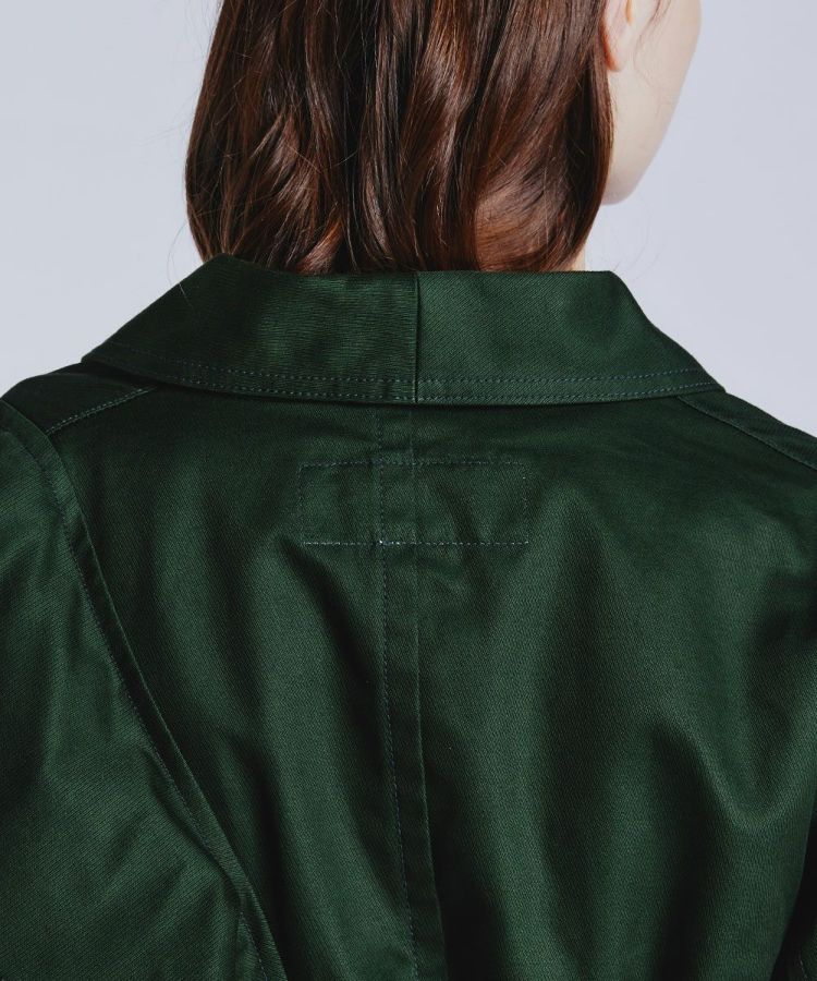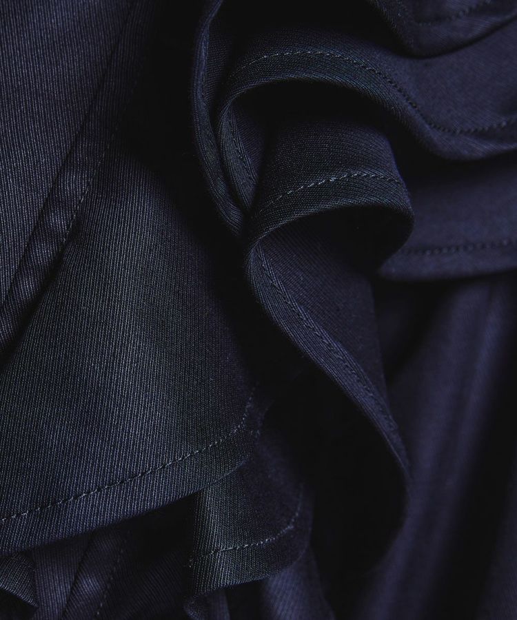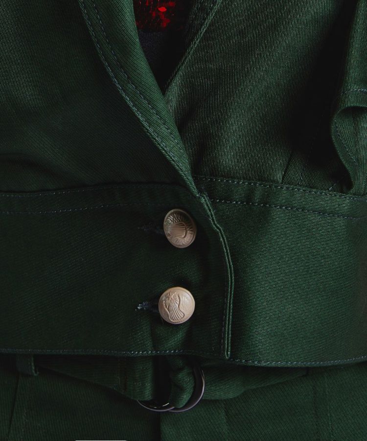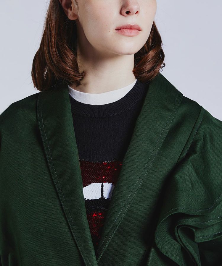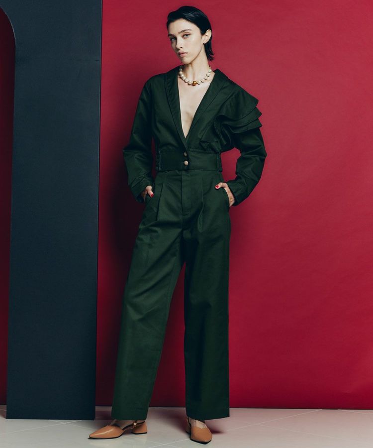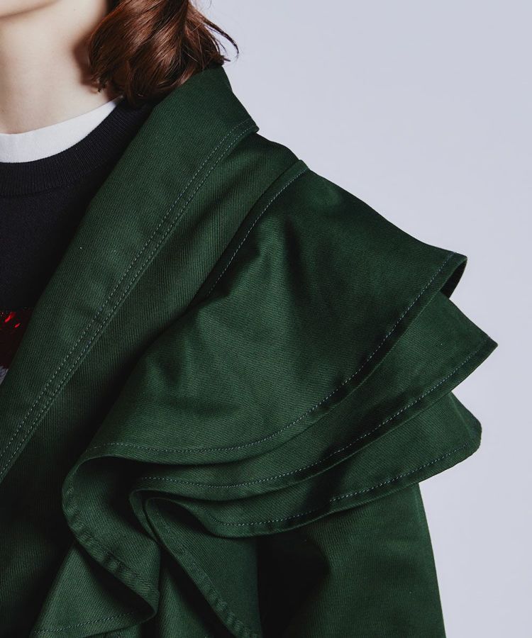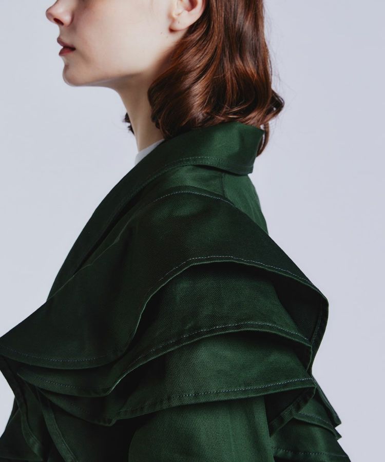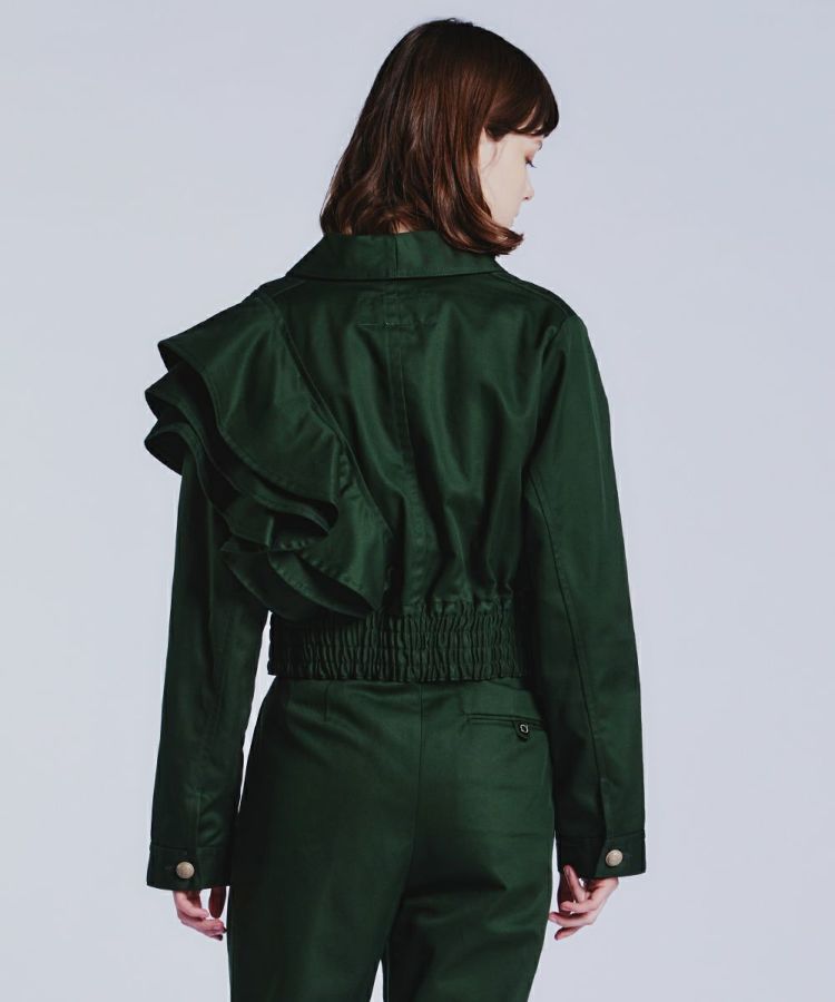 エッジの効いた着こなしを叶えてくれる、ショート丈のジャケット。左肩にフリルをあしらったアシンメトリーのデザインがポイントで、一枚で主役になるアイテムです。しっかりとしたウェイト感があるキャバリーツイル生地を使用しており、 柔らかな風合いと着心地の良さが魅力的。オリジナルボタンもポイントになり、カジュアルなコットン生地ながらもほんのりクラシカルなムードが効いています。