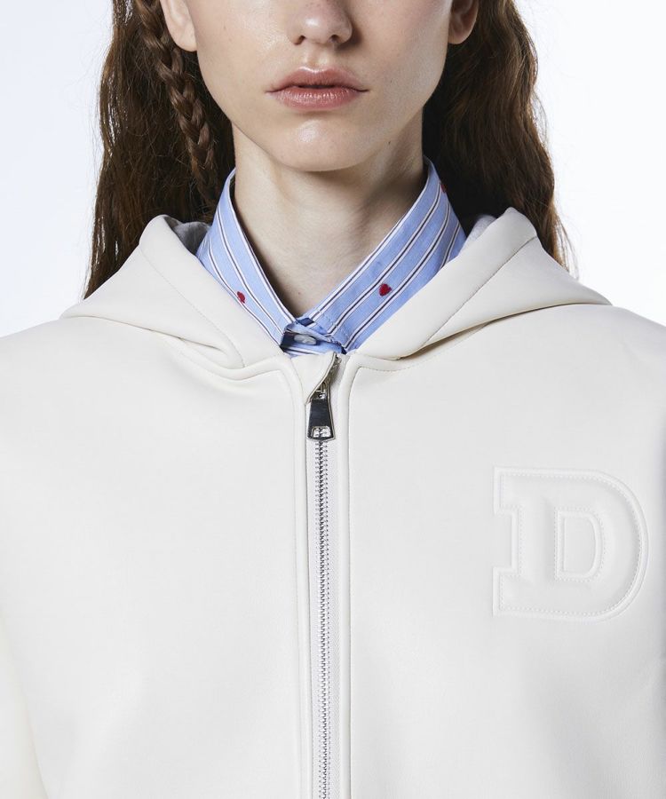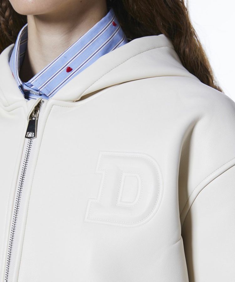 フェイクレザーをボンディングしたオリジナル生地を使用した今季イチオシのパーカージャケット。胸元にはレザーエンボス刺繍であしらった「H」がさりげないアクセントとなり、シンプルながら個性をプラスしました。軽さと保温性を兼ね備えて機能性も抜群。スタイリングやシーンを選ばず幅広く活躍します。