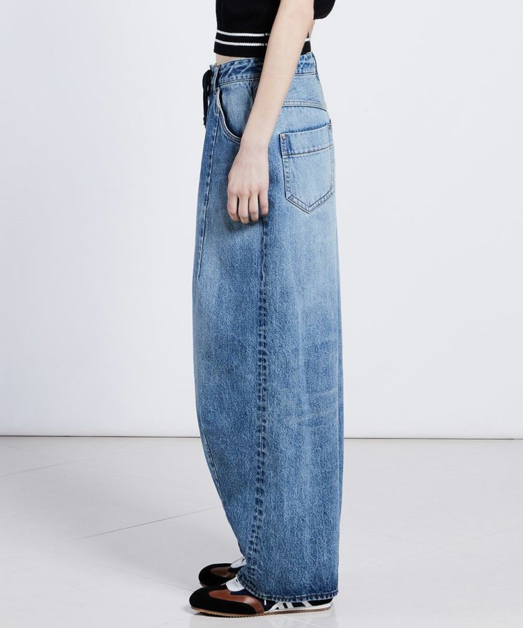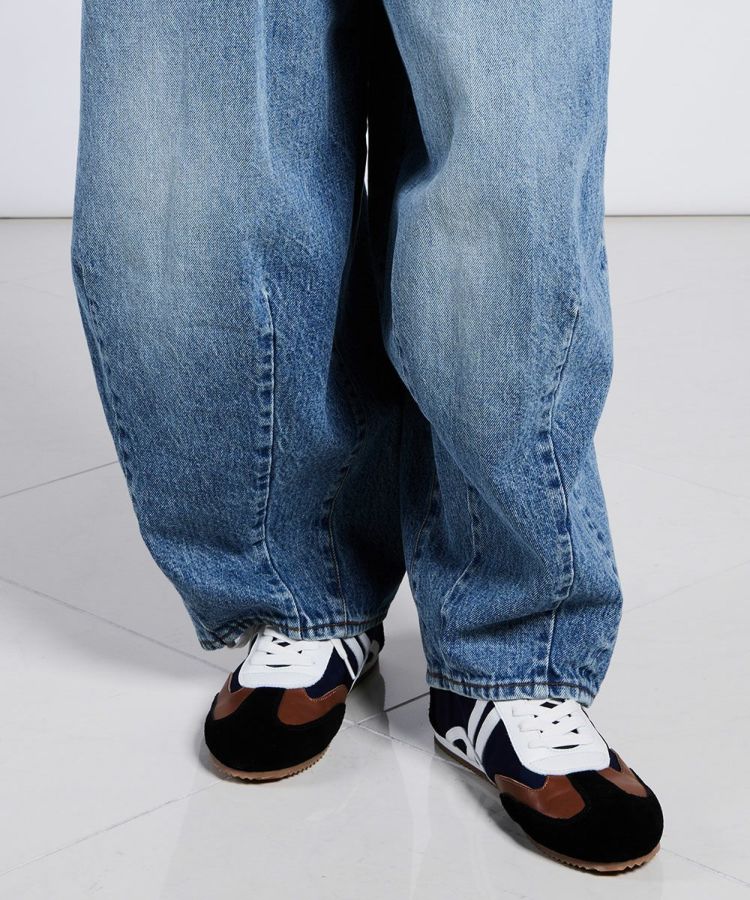 ゆったりリラクシンなシルエットがかわいいデニムパンツ。ウエストと裾のダーツ処理が、独特のボリューム感を出しています。心地よいインパクトがあり、コーディネートに変化を与えてくれるため、シンプルなトップスを合わせてもサマになるのがうれしいポイント。ヒップラインがきれいに見えるのも魅力です。