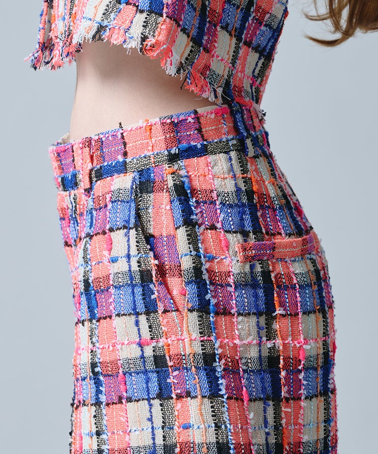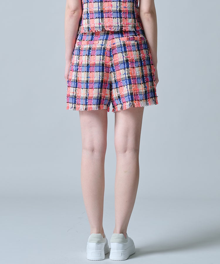 表情豊かなツイード生地が上質な雰囲気のショートパンツ。カラフルなチェック柄がコーディネートに華やかさを添え、コーディネートのアクセントとして映えます。コンパクトな丈感は、シンプルなTシャツと合わせるだけでバランスよくまとまり、軽やかな印象に。同素材のベスト(型番:0204070262)と組み合わせれば、セットアップスタイルも楽しめます。