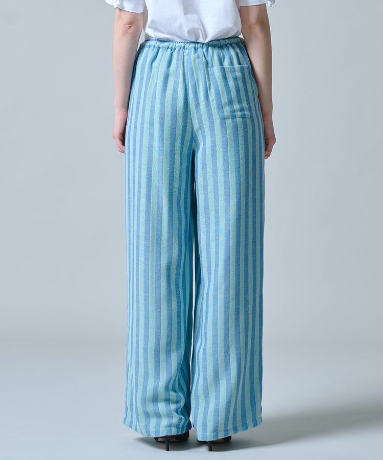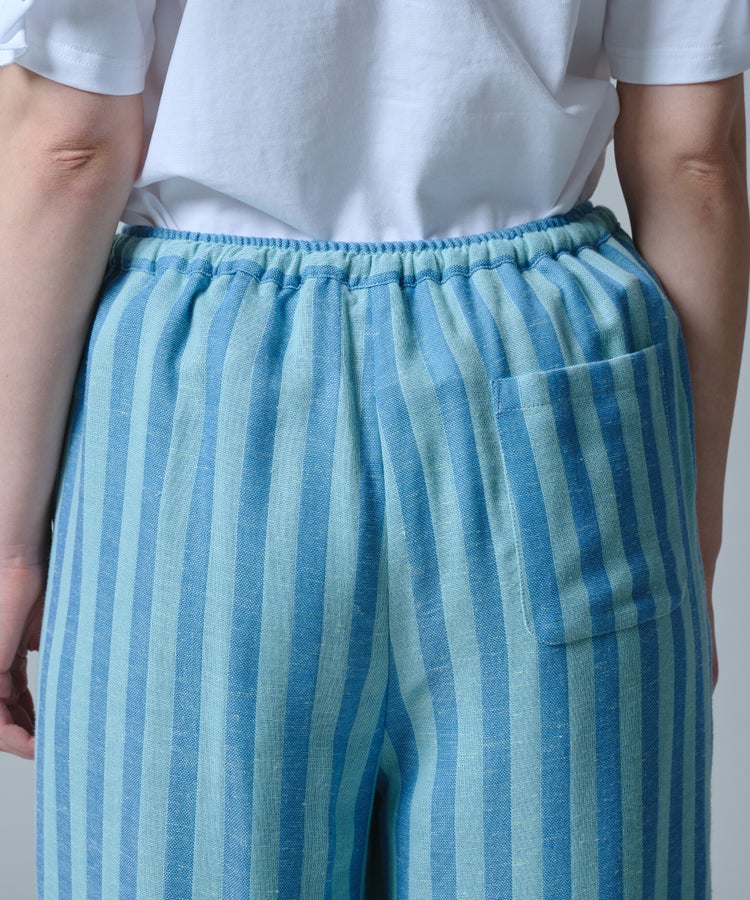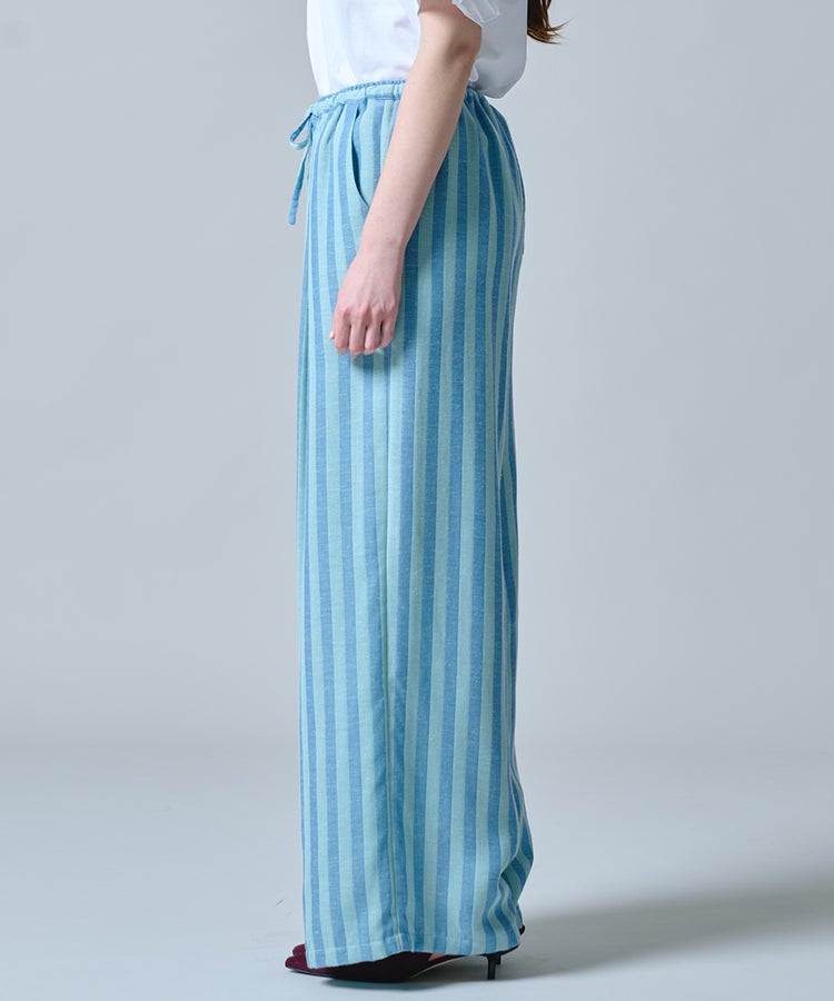 ミント×ブルーのカラーリングが爽やかな雰囲気のパンツ。ストライプ柄が縦のラインを強調し、スタイルアップが叶います。ウエストはゴム仕様で、長時間の着用でも快適なはき心地に。シンプルなTシャツと合わせるだけで、軽やかでキュートなスタイリングが楽しめるアイテムです。
