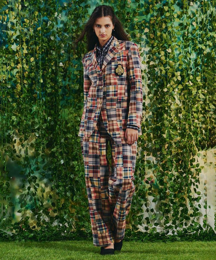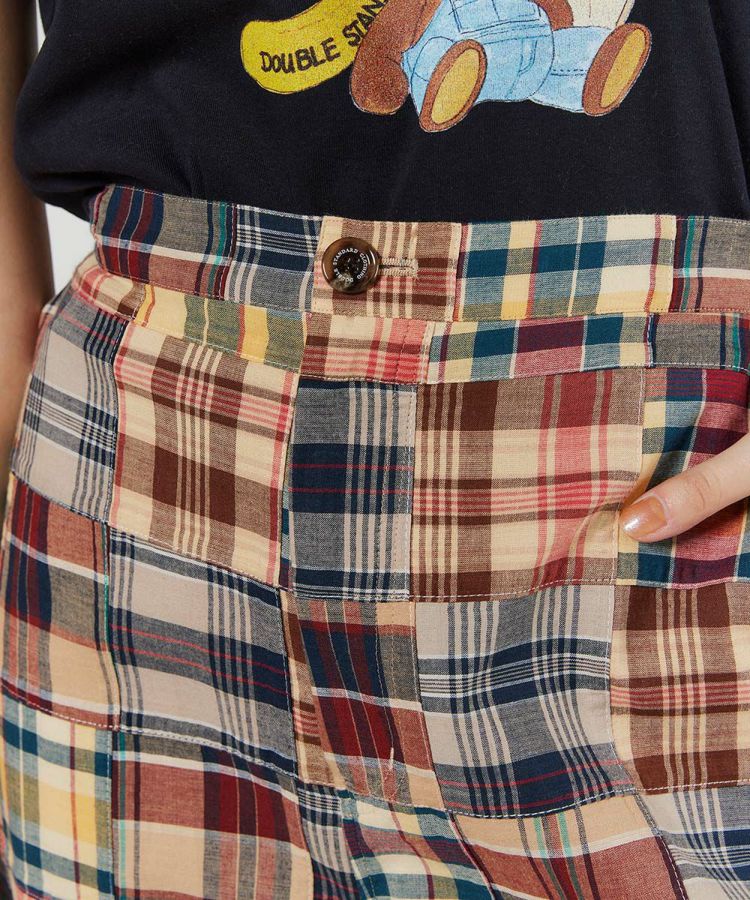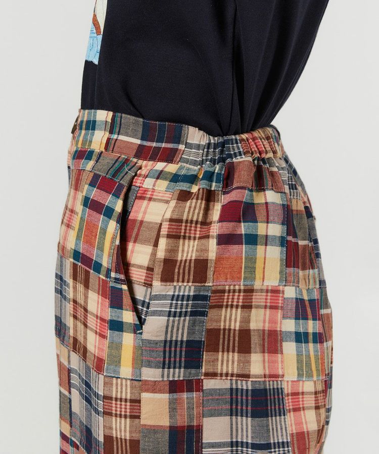 マドラスチェック柄をパッチワークにした、インパクトのあるパンツ。Tシャツに合わせるだけでコーデがサマになる程よいワイドシルエットで、着まわし力も抜群です。ウエストはボタンできちんと感がありながらも、バックはゴム仕様なので穿き心地楽チン。腰まわりやヒップラインをさりげなくカバーしてくれるのもうれしいポイントです。