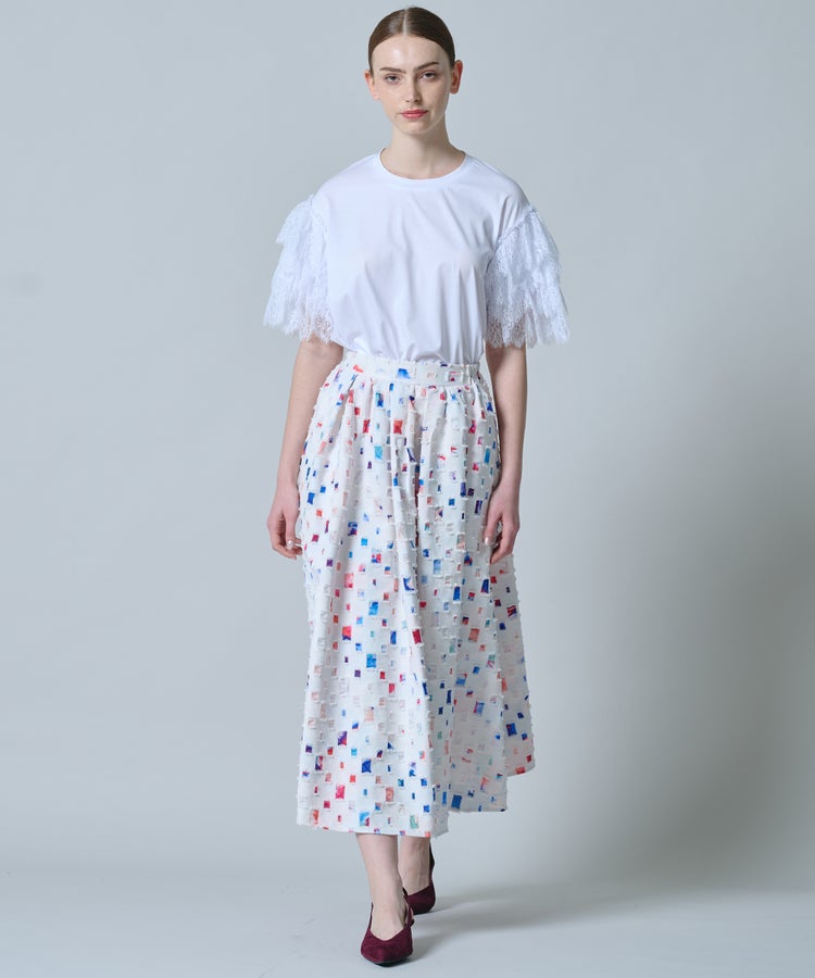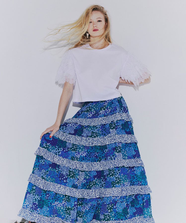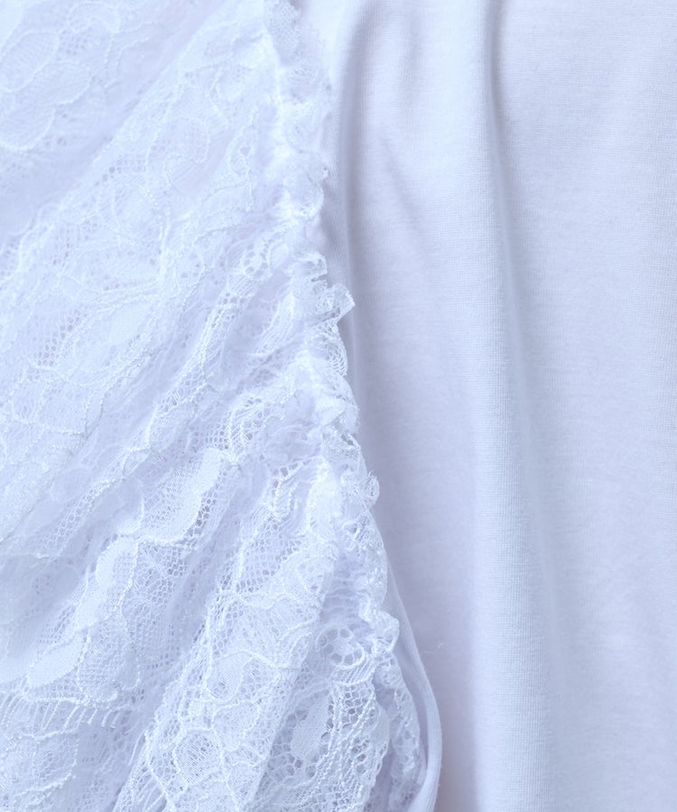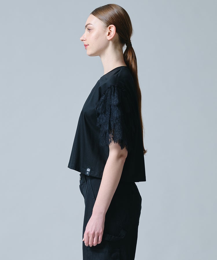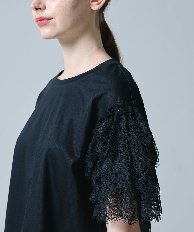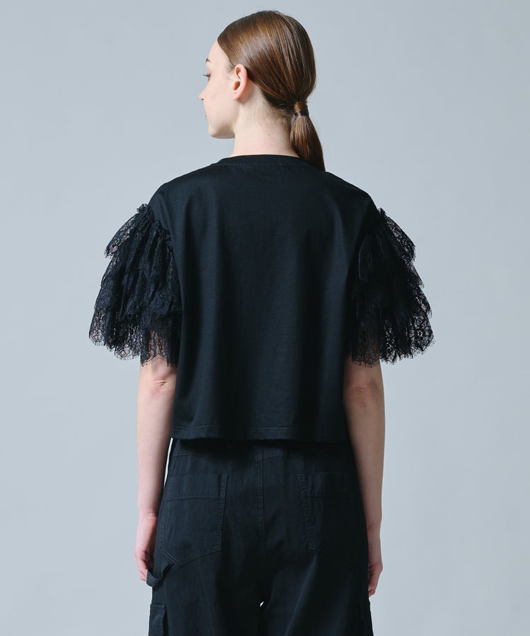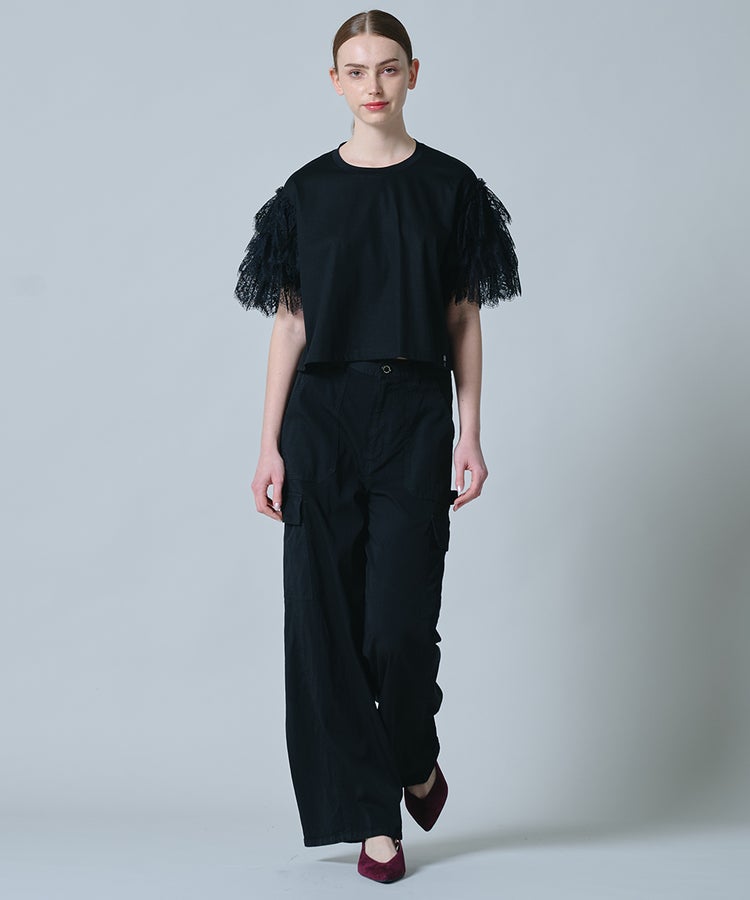 ボリューム感のあるフリルスリーブが目を引くTシャツ。シンプルながらもエレガントな印象に仕上げ、二の腕周りのシルエットをカバーしてくれるのも嬉しいポイントです。カラーは着回しやすいオフホワイトとブラックの2色展開。柄物のボトムスとも好相性で、コーディネートに取り入れるだけで品のあるスタイリングが楽しめます。