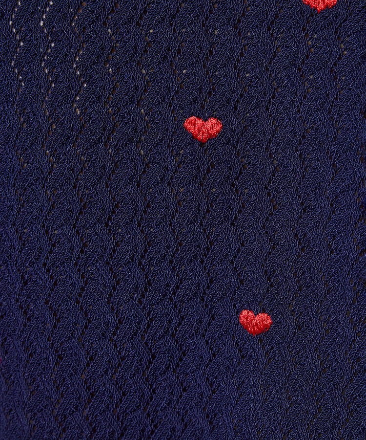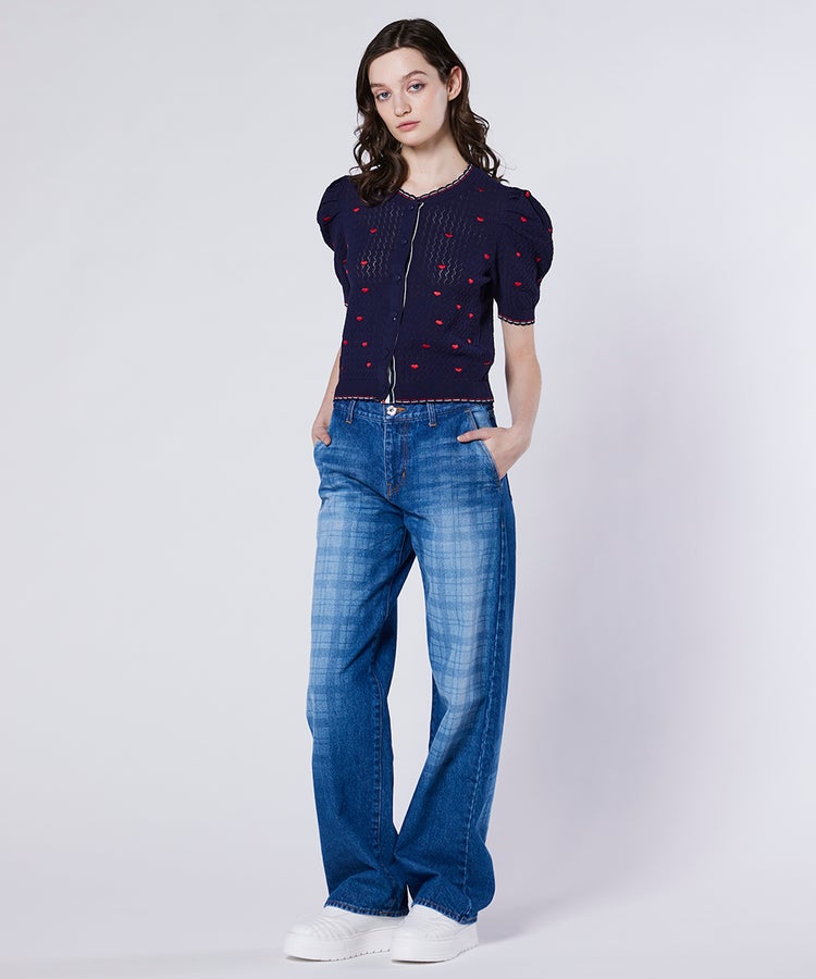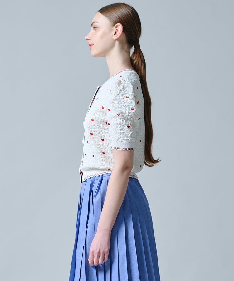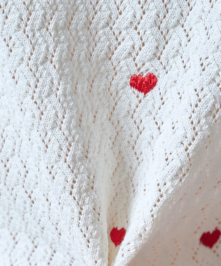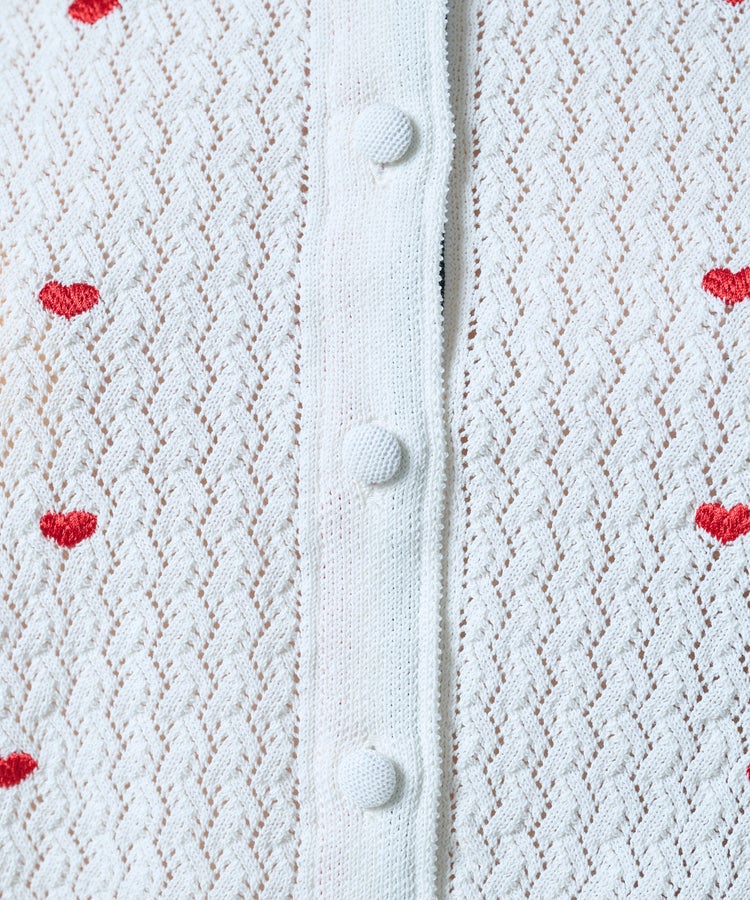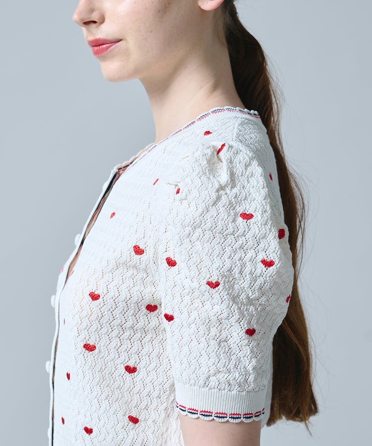 ハート刺繍を全面にあしらった、キュートなカーディガン。程よいボリュームのパフスリーブがフェミニンな印象を引き立てます。二の腕まわりを自然にカバーしてくれるのも嬉しいポイント。軽く羽織ってレイヤードを楽しんだり、ボタンを留めてトップスとして着たりと、着こなしの幅が広がるアイテムです。