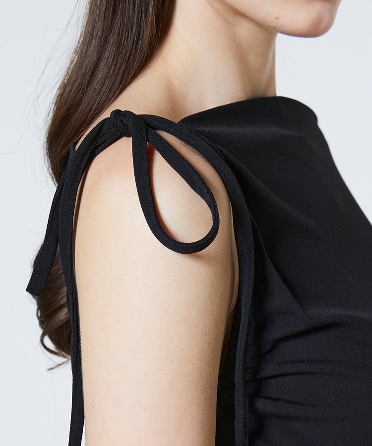 アシンメトリーなワンショルダーデザインが、今っぽい抜け感を引き立てるワンピース。袖にあしらったリボンがさりげなくフェミニンなエッセンスを添えます。鎖骨やデコルテラインを美しく見せ、上品なセンシュアルさを演出。パーティーやオケージョンシーンにも映え、特別な日の装いにも活躍する一着です。