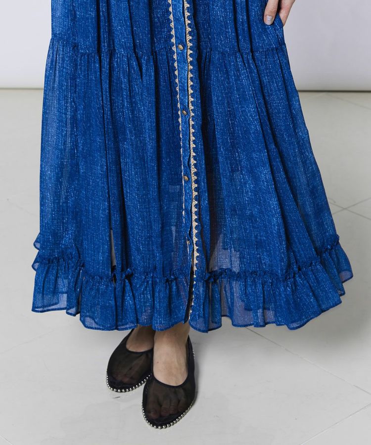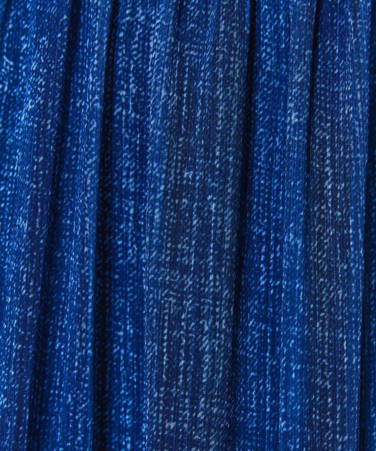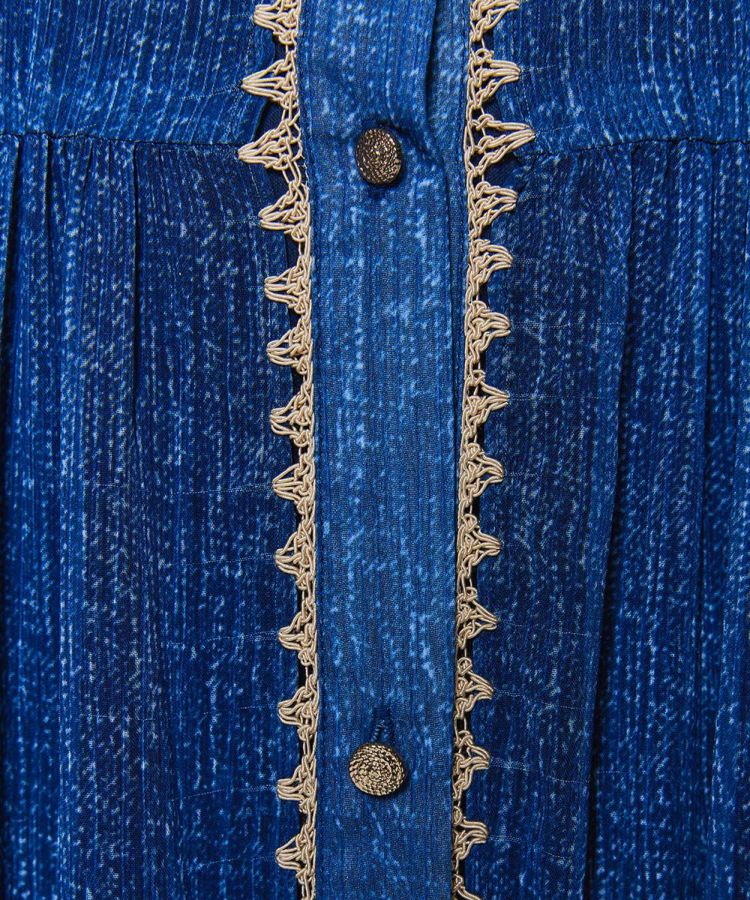 デニムプリントの鮮やかなインディゴブルーに、ベージュのアクセントが映えるワンピース。程よい透け感のあるシアー素材を使用し、女性らしいヘルシーな肌見せを叶えました。スカート部分はティアード調に仕上げ、動きのある華やかな印象に。甘さを抑えたクールさとフェミニンさを兼ね備えた、大人のスタイリングにぴったりな一着です。