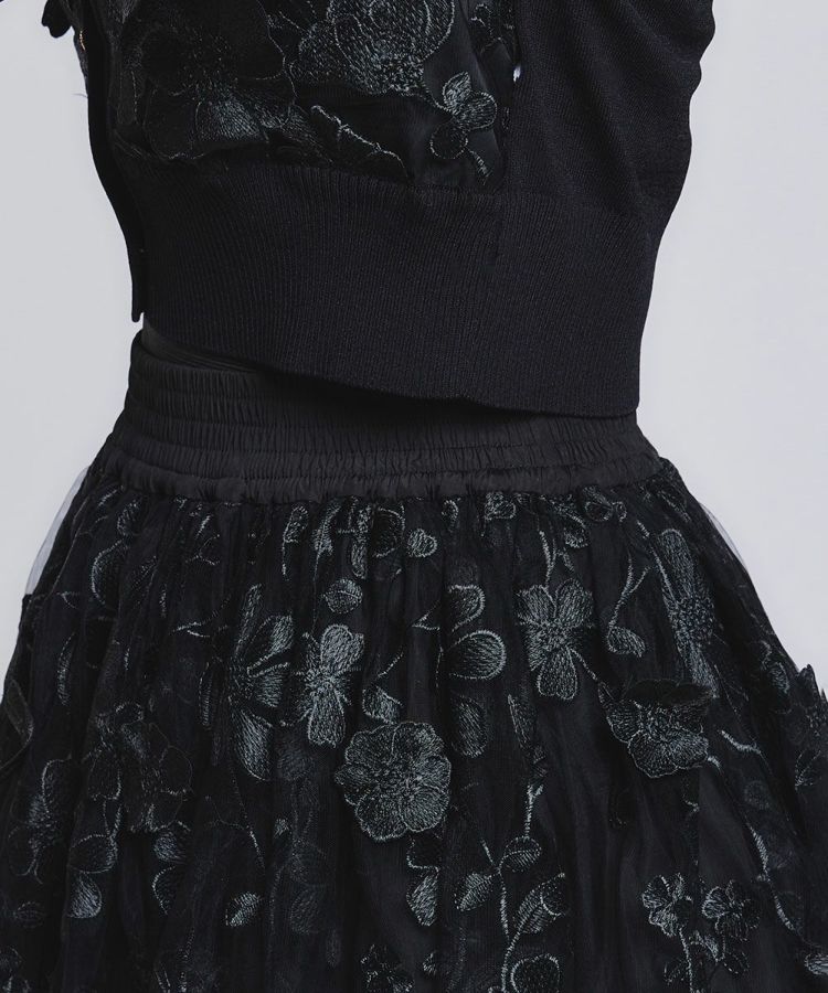 立体的にあしらった、大小のフラワーモチーフレースが目を惹くエレガントなスカート。インナーにパニエが付いているためふんわりとしたボリューム感があり、美しいシルエットを演出します。歩くたびにフラワーモチーフが動き、ドラマチックな存在感がある大人かわいいアイテム。同素材のカーディガン(型番0309230241)とセットで楽しむのはもちろん、お手持ちのブラウスや、夏はキャミソールなどと合わせるのもおすすめです。