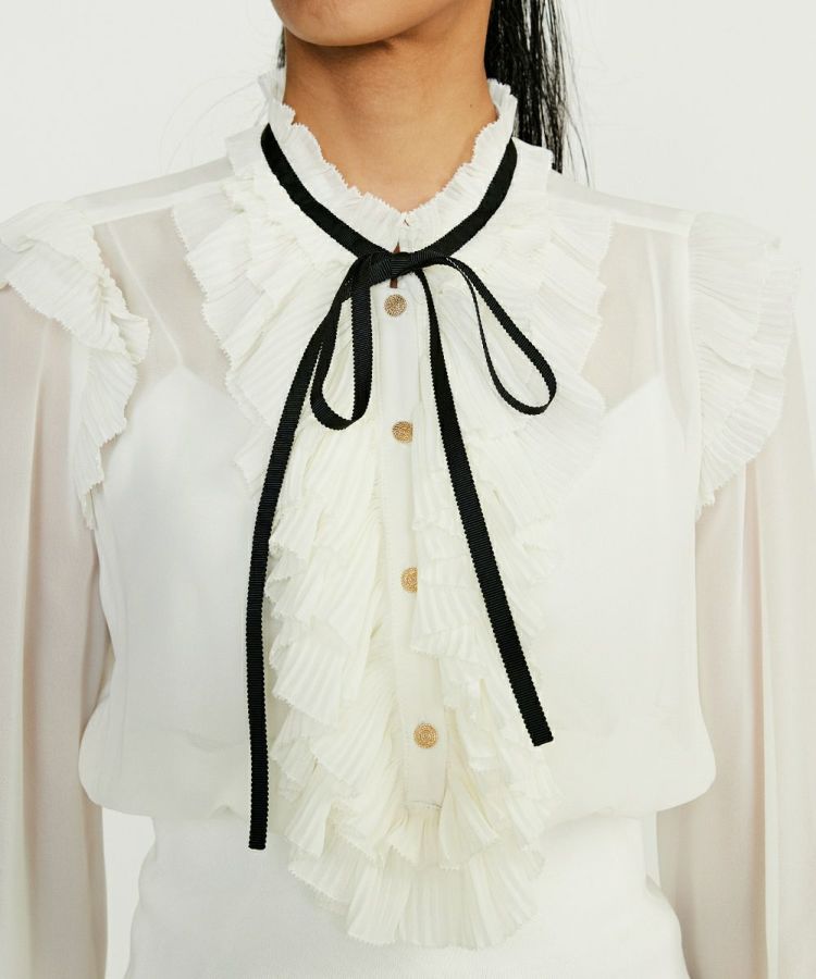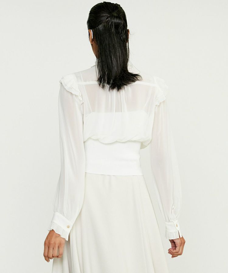 シアーな質感が美しいブラウス。シフォンクリスタルプリーツをギャザーフリルに、端はピコ始末にするなど贅沢なデザインディテールが光ります。ウエスト部分には定番のヴィスコースナイロンのダル糸でリブ編み仕様にしており、とても上品なルックスに仕上がっています。どんなボトムと合わせても品良くきれいめなコーディネートが完成するブラウスです。