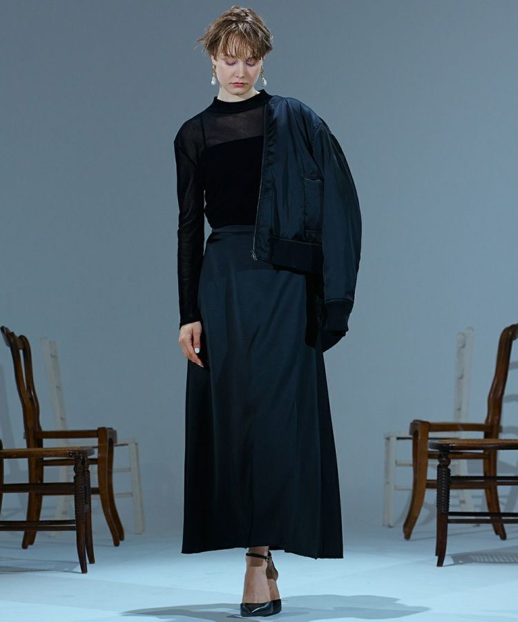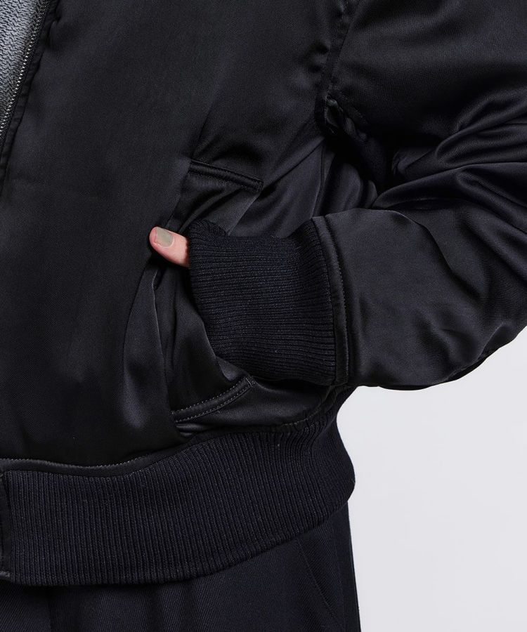 なめらかで美しい表面感が特長になった、MA-1タイプのジャケット。リッチな光沢のあるサテン生地を使用することでカジュアルになりすぎず、エレガントな大人のMA-1に仕上げました。女性らしさを出せるコンパクトなシルエットもポイント。中綿を入れているため、細身でも暖かく着られます。ベーシックなデザインなので着まわし力は抜群。ワンピースなどと組み合わせて甘辛コーデを楽しむのもおすすめです。