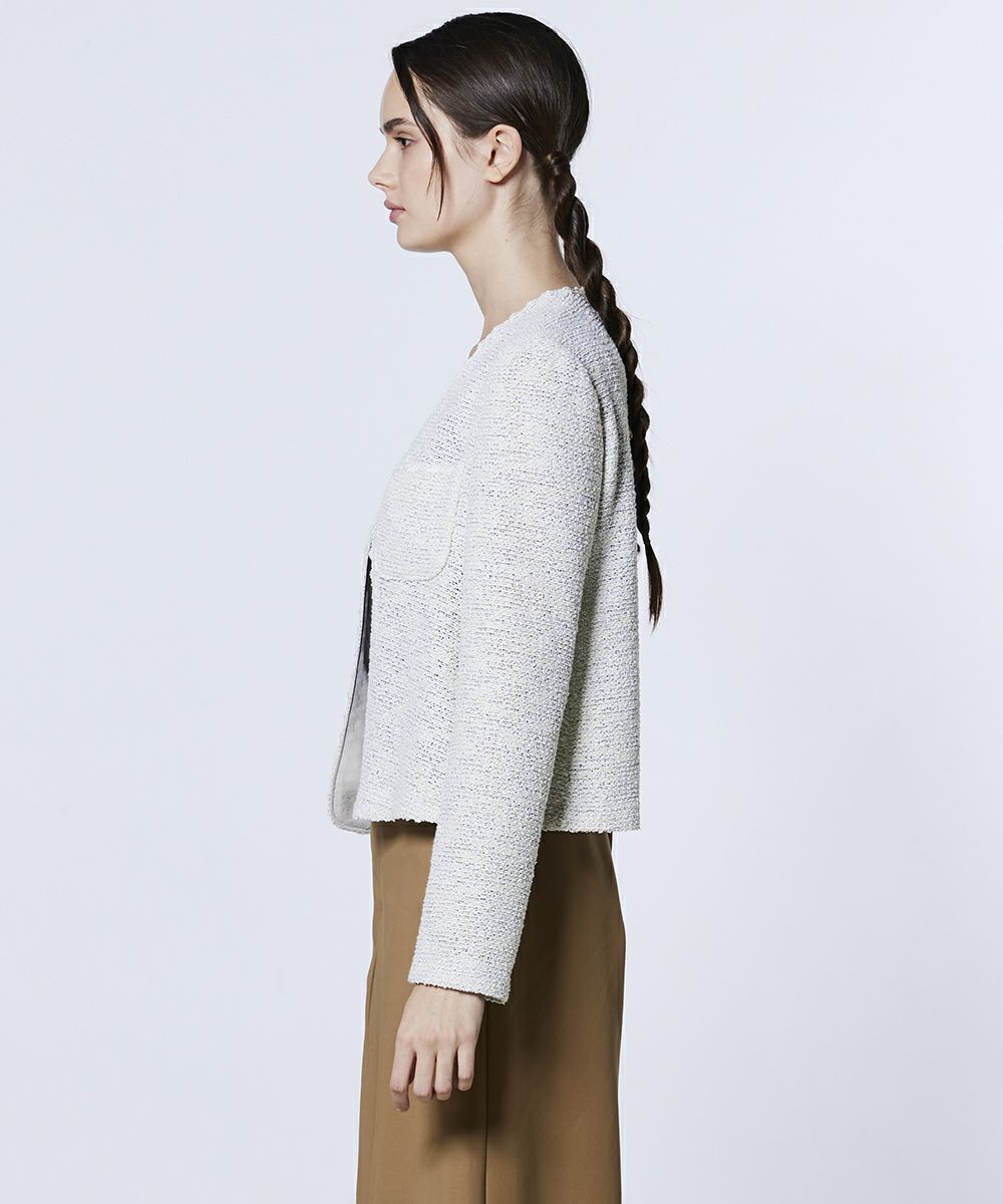 程よい透け感のあるメッシュ素材が、軽やかで女性らしい印象を演出するジャケット。ノーカラーデザインで首元をすっきりと見せ、抜け感のあるスタイリングを叶えます。ポケットや縁にあしらったラインが、さりげないデザインアクセントに。キャミソールと合わせればセンシュアルなムードに、シャツと重ねればオフィスカジュアルにも対応する、着こなしの幅が広い一着です。