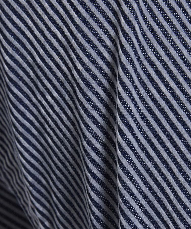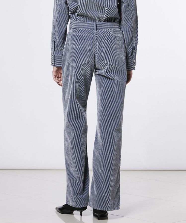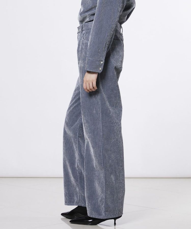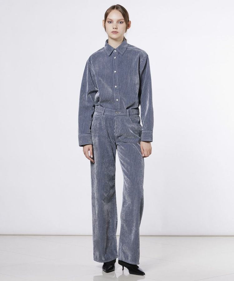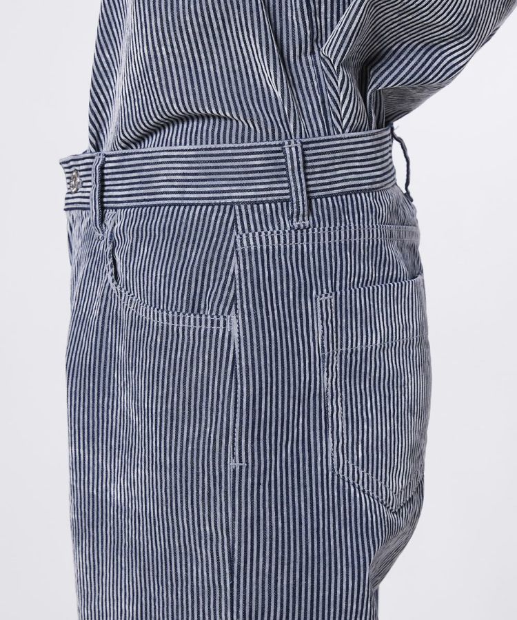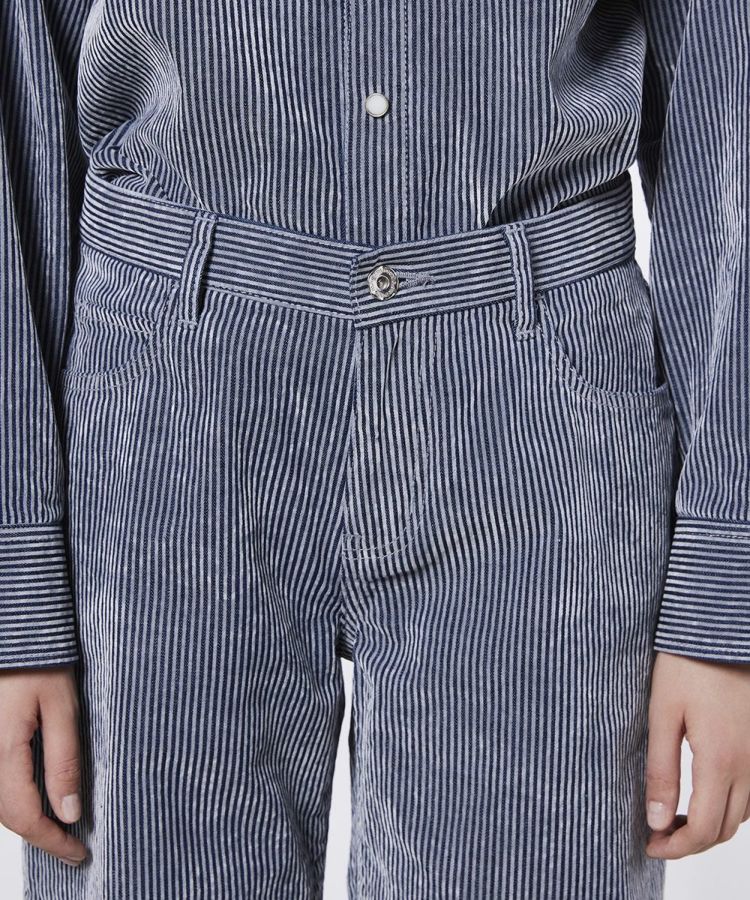 ライトオンスデニムにストライプのフロッキープリントを施したパンツ。控えめな柄使いがコーディネートのアクセントになり、シンプルなスタイリングにも程よい個性をプラスします。ストレートシルエットで流行に左右されず、どんなトップスとも合わせやすい万能デザイン。同素材のシャツ(型番:0305070261)とセットで着れば、デニムライクな統一感のあるスタイルを楽しめます。