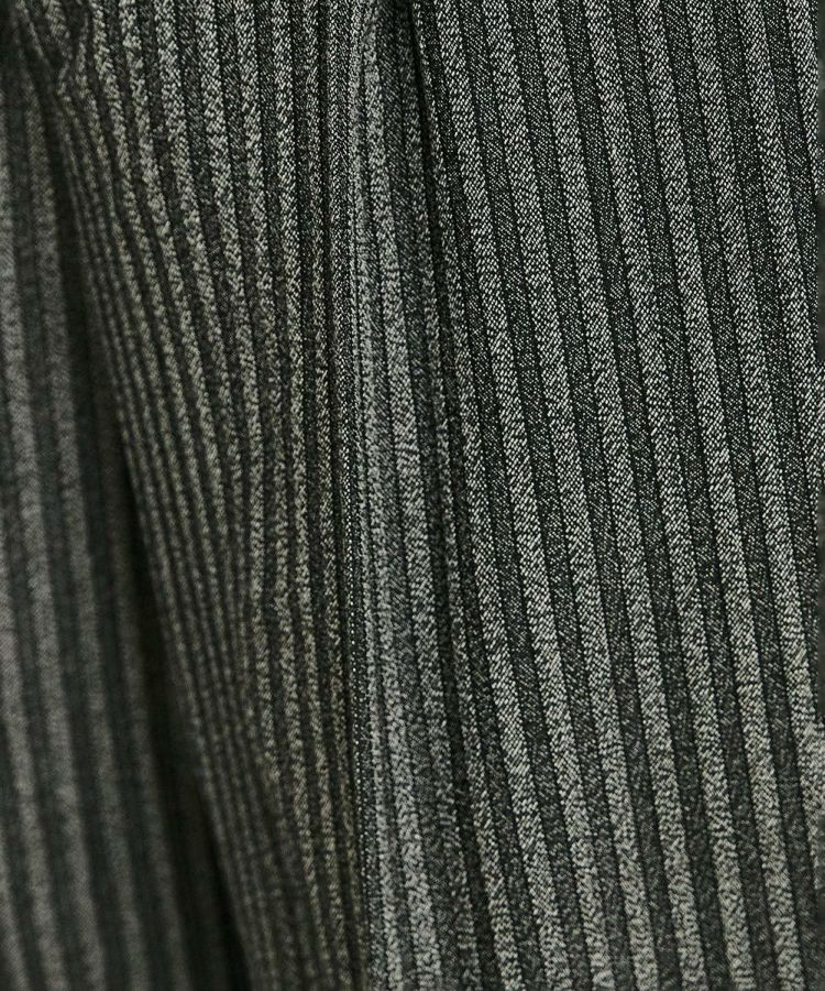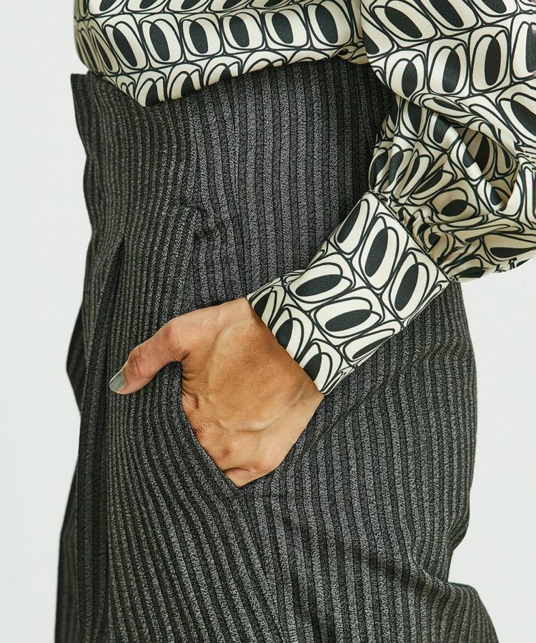 暗めのカラーリングでシックに穿きこなせるワイドパンツ。細めのストライプがクラシックな雰囲気で、今季らしいコーディネートにぴったり。ハイウエストに加え、タックを入れることで縦のラインがさらに強調されるため脚長効果抜群です。ベルトループをなくし、ウエストまわりがすっきり見えるのもポイント。シャツなどをインするもよし、大きめのニットを合わせても美脚見えがキープされるのも魅力です。