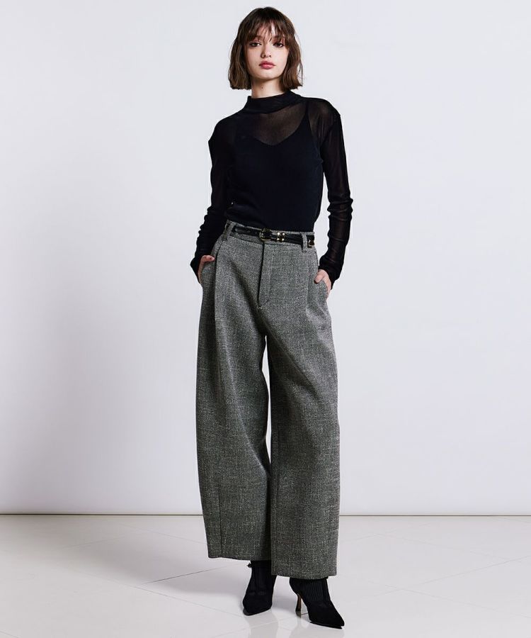 梳毛調合繊トリクションとレーヨンリング糸を使用し、ウールのような表情・風合いを出したツイード素材のパンツ。ボンディング加工をすることで、軽さを出すとともに、ハリ感のある立体的なワイドシルエットに仕上げました。裾に向かってやや丸みがある独特のフォルムで、横から見てもサマになる、モード感のある一本です。