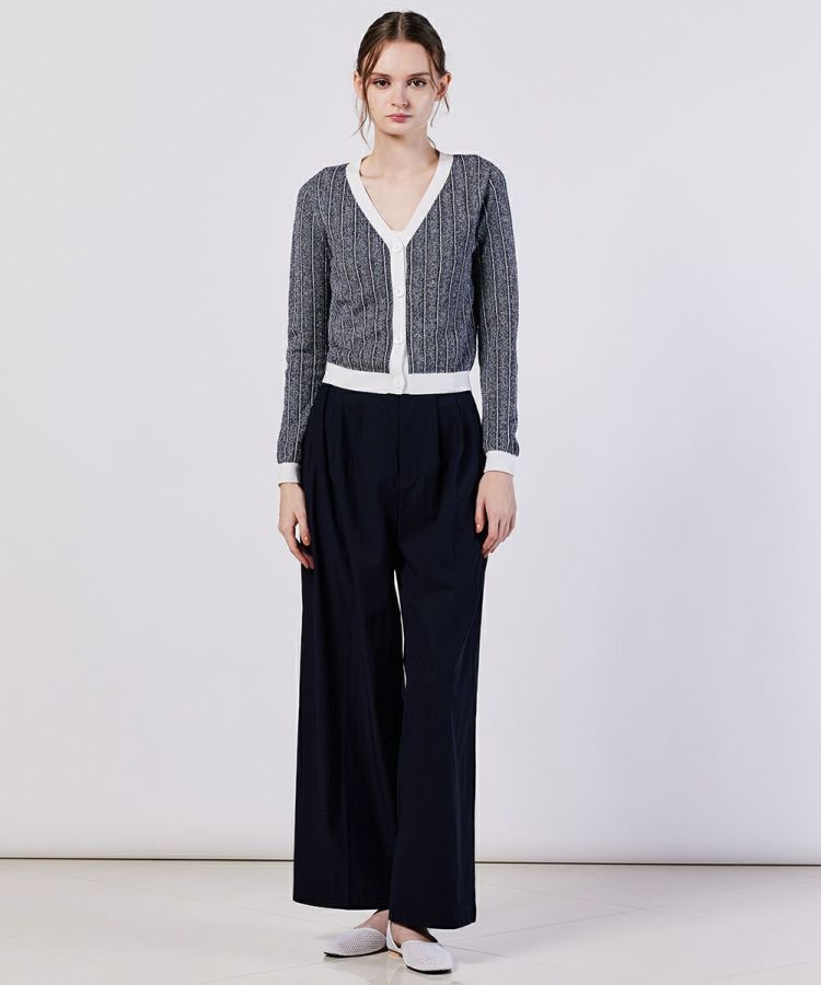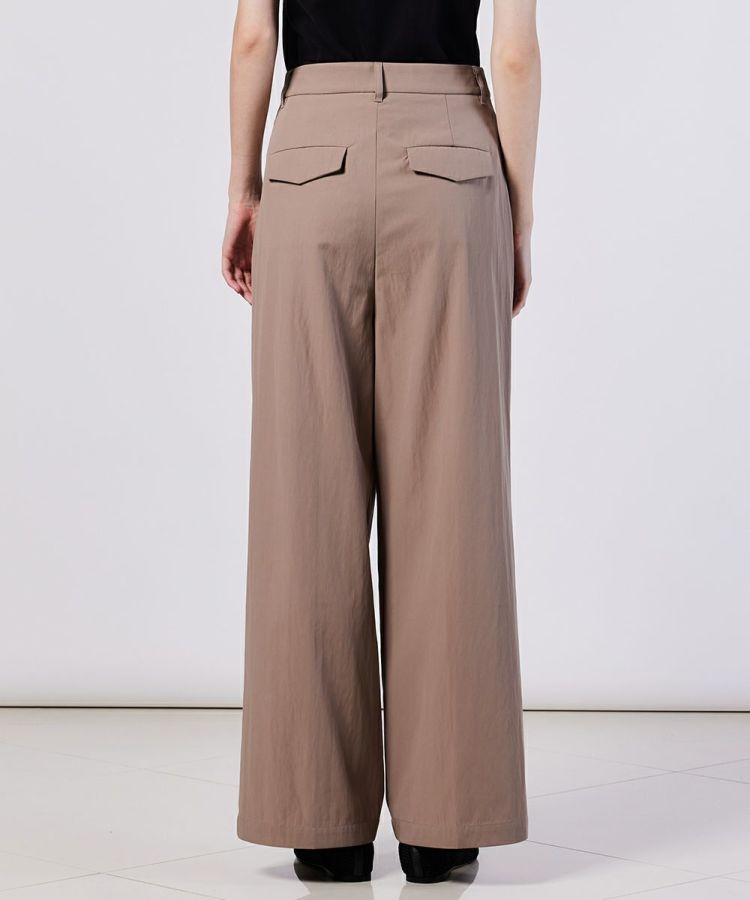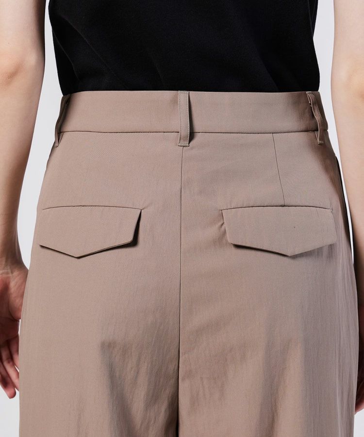 フロント部分にしっかりとタックを入れ、パリッとした印象に仕上げたパンツ。縦のラインが強調されるのでワイドシルエットでもすっきり、スタイリッシュに穿きこなすことができます。ヒップラインや太もものラインをカバーしてくれるのもうれしいポイント。普段使いはもちろん、オフィススタイルにも重宝する一本です。