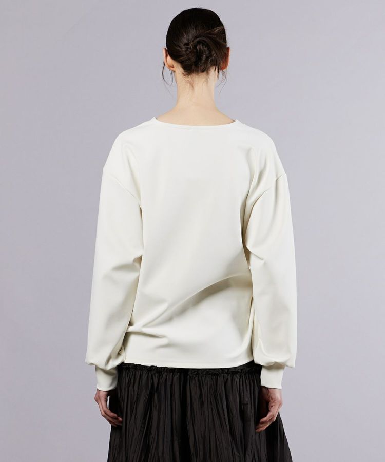 ゆったりとしたシルエットがリラクシンな雰囲気のスウェットトップス。程よく膨らみ感のあるダンボール素材を使用し、軽やかで柔らかな肌ざわりを実現しました。首元はVネック仕様で抜け感をプラスしつつ、裾は折り込んだような変形デザインで着るだけでこなれた印象に。ボリュームのあるスカートやワイドパンツと合わせた、今っぽいラフなスタイリングにもぴったりです。