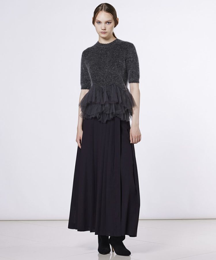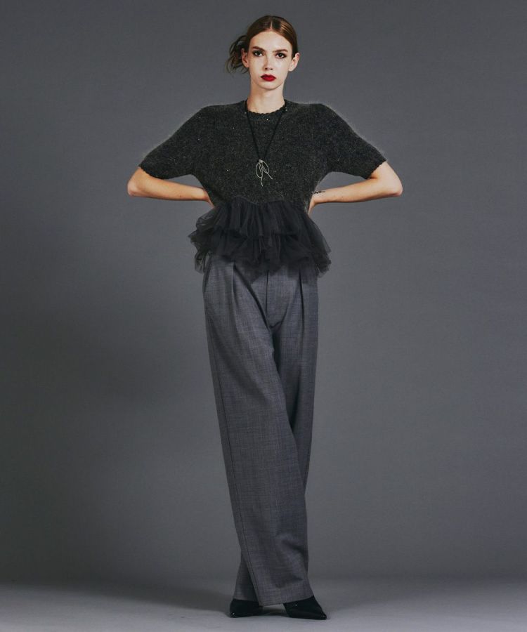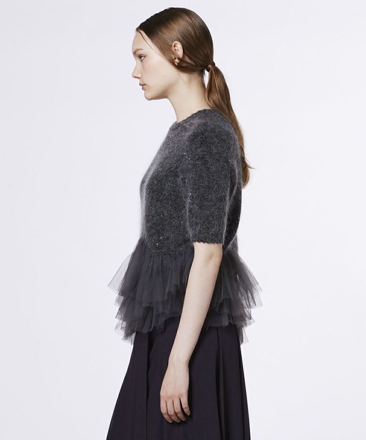 ボリューム感のあるチュールペプラムをあしらった、華やかなニット。ふんわりと柔らかなモヘア素材を使用し、肌ざわりの良さと快適な着心地を叶えました。ティアード調のペプラムは腰まわりをさりげなくカバーし、スタイルアップも期待できるデザイン。同系色のパンツを合わせれば、簡単に大人モードなスタイリングが完成します。