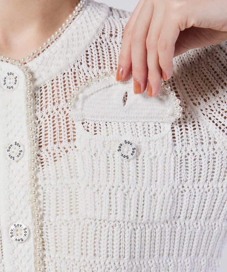 透かし編みが涼しげなカーディガン。段々になった編み模様が、コーディネートにさりげない華やかさをプラスしてくれます。また、胸元のポケットやオリジナルのボタンがカジュアルなアクセントに。コンパクトなシルエットなのでボトムとのバランスを取りやすく、スタイルアップ効果も抜群です。