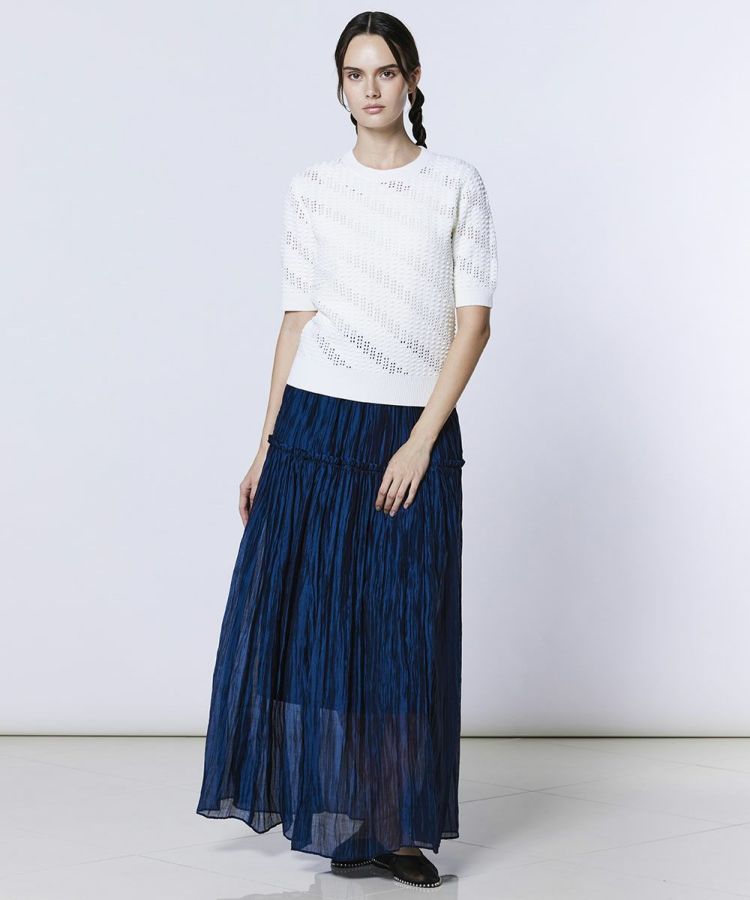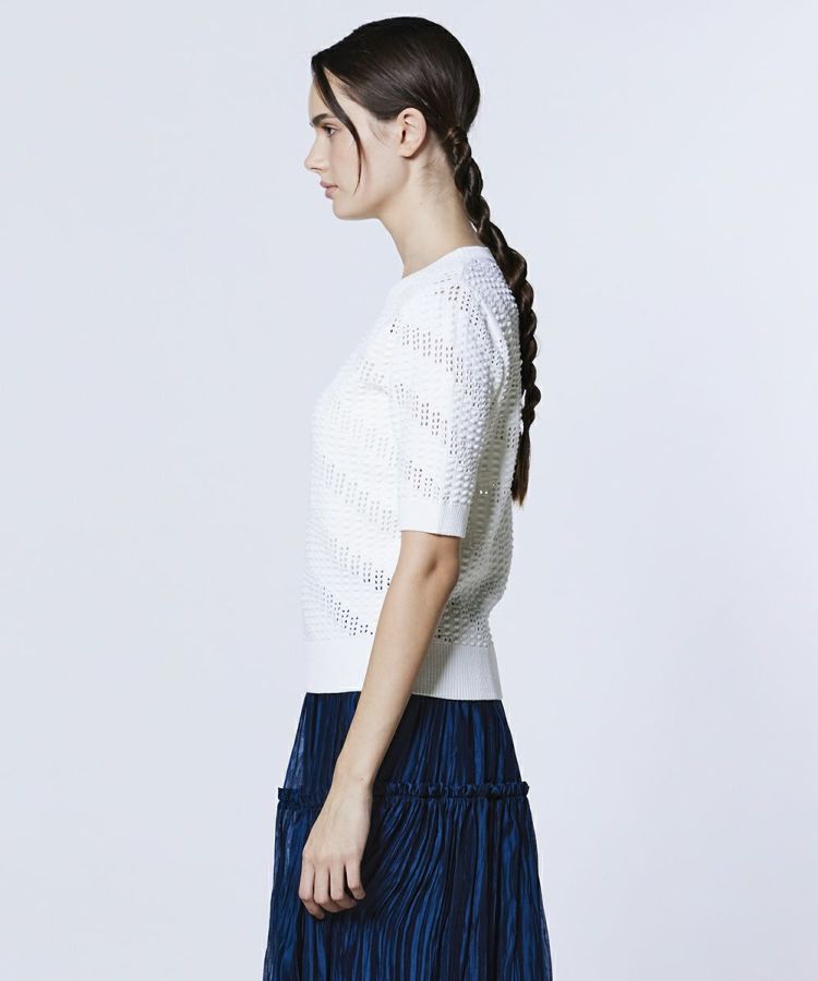 斜めストライプ調の透かし編みが目を引く、表情豊かなニットトップス。程よい透け感が女性らしさを引き立て、さりげない肌見せを楽しめます。着回し力の高いオフホワイト、コーディネートの差し色になるピンク、奥行きのあるネイビーの3色展開。シンプルながらもデザイン性があり、合わせるボトムスを選ばず日常使いからきれいめスタイルまで幅広く活躍します。