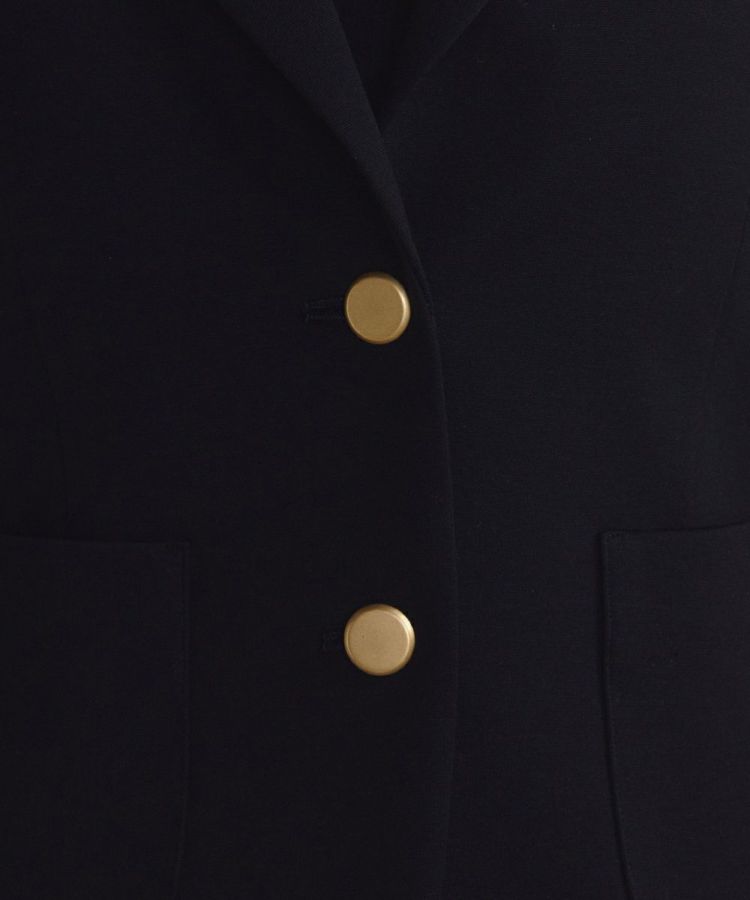 コンパクトでフェミニンなシルエットで仕立てたテーラードジャケット。襟は細身にすることで軽やかでスタイリッシュな印象に仕上げています。パワーショルダー仕様にすることで、さりげないエッジをプラスし女性らしくもクールな着こなしを実現。全身のスタイルが決まりやすく、都会的なムードのある一着です。金色のボタンがクラシカルなアクセントをプラスしています。
