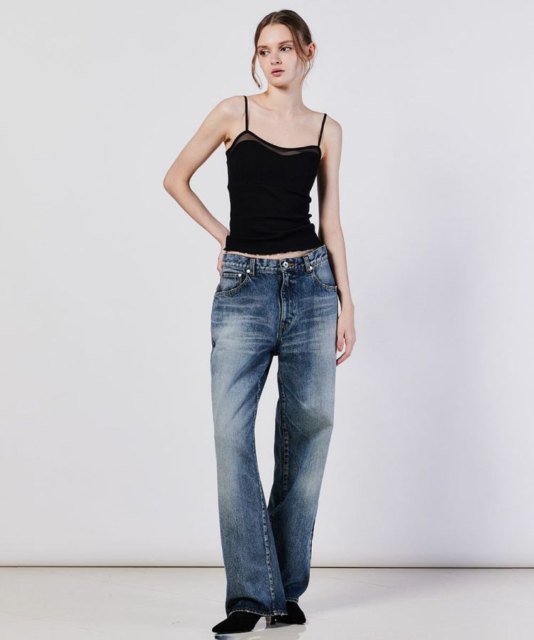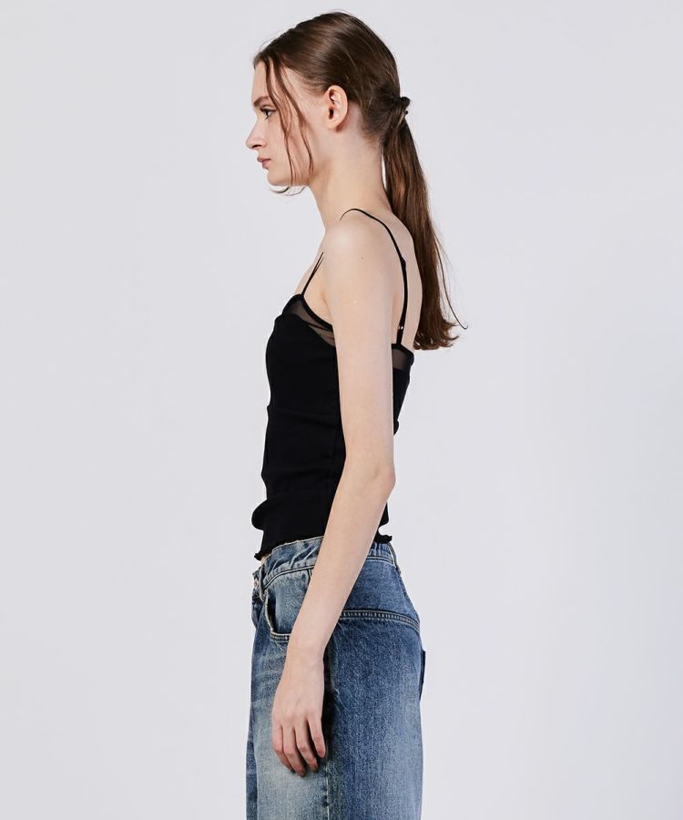 チュールのディテールをMIXしたキャミソールです。透け感のあるチュール部分が肌をセンシュアルに演出。コットン混素材で気軽に着られるうえ、肌触り良く、締めつけ感のない付け心地です。カップ付きなので、これ一枚でもサマになるのが魅力。ざっくりと大きめのシャツに合わせたり、トップスからチラ見せしたいときにもぴったりです。付属のパッドはつけ外し可能で、紐は長さを調整できるのもうれしい。